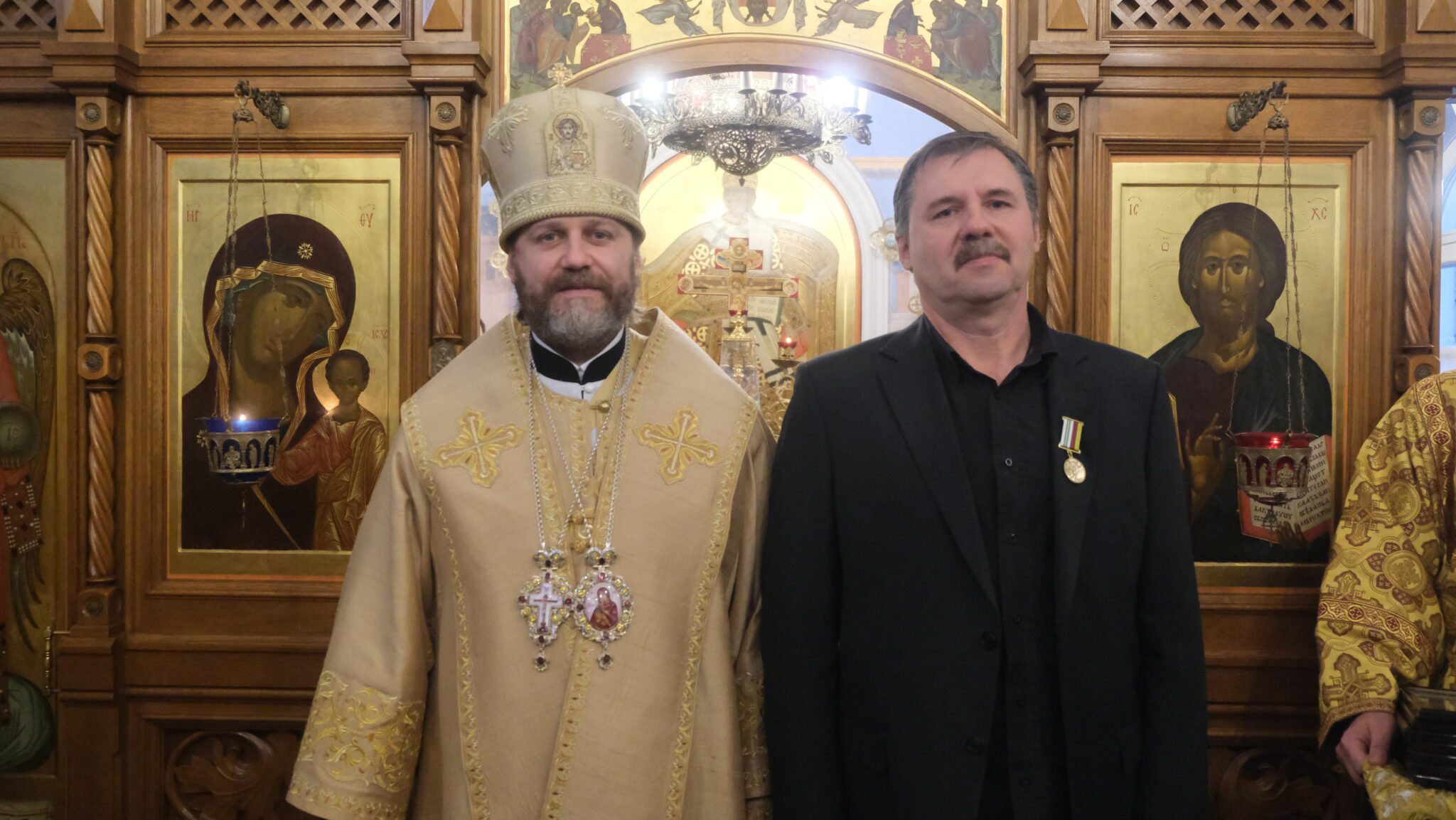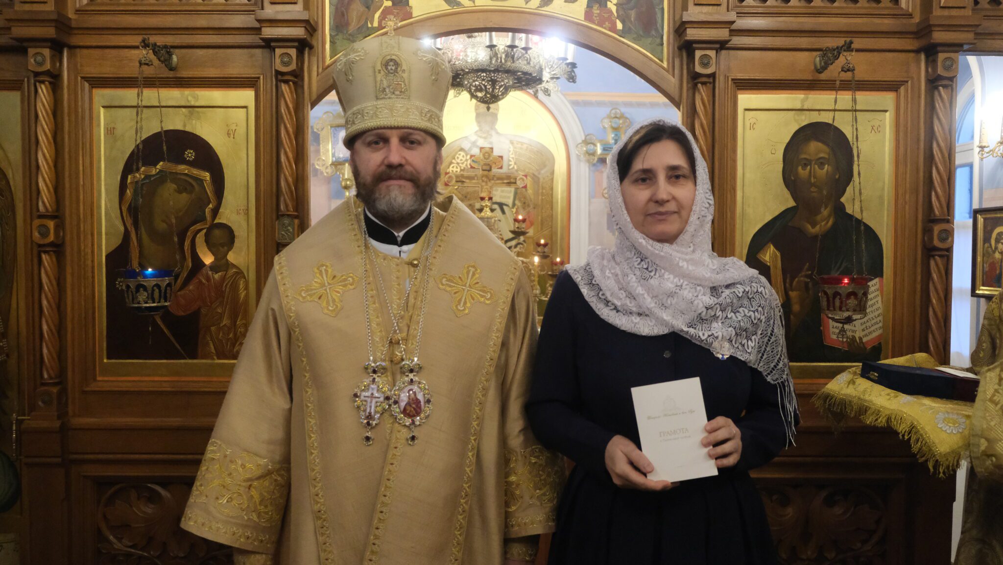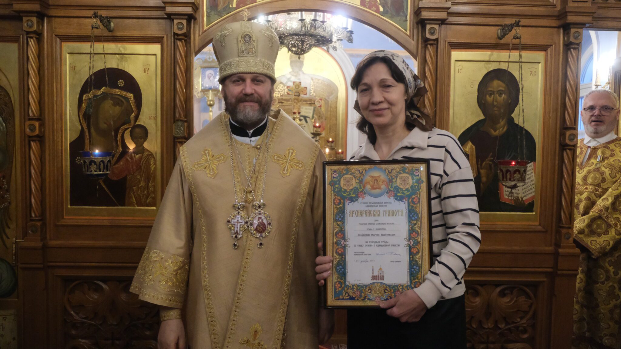 Затем состоялось награждение за усердные труды и в связи с 60-летием клирика Александро-Невского храма иерея Александра Королева и ктиторов, потрудившихся над благоукрашением и росписью внутреннего пространства храма. Также, Владыка почтил сотрудников прихода благодарственными грамотами.