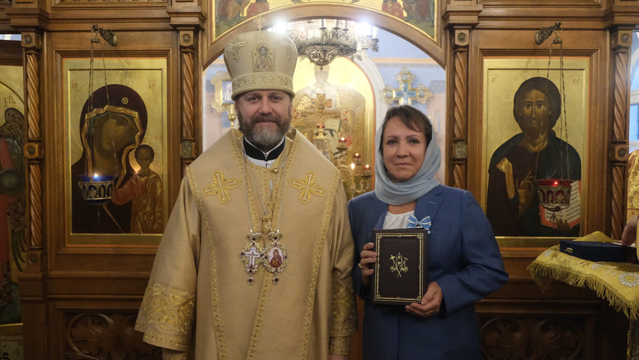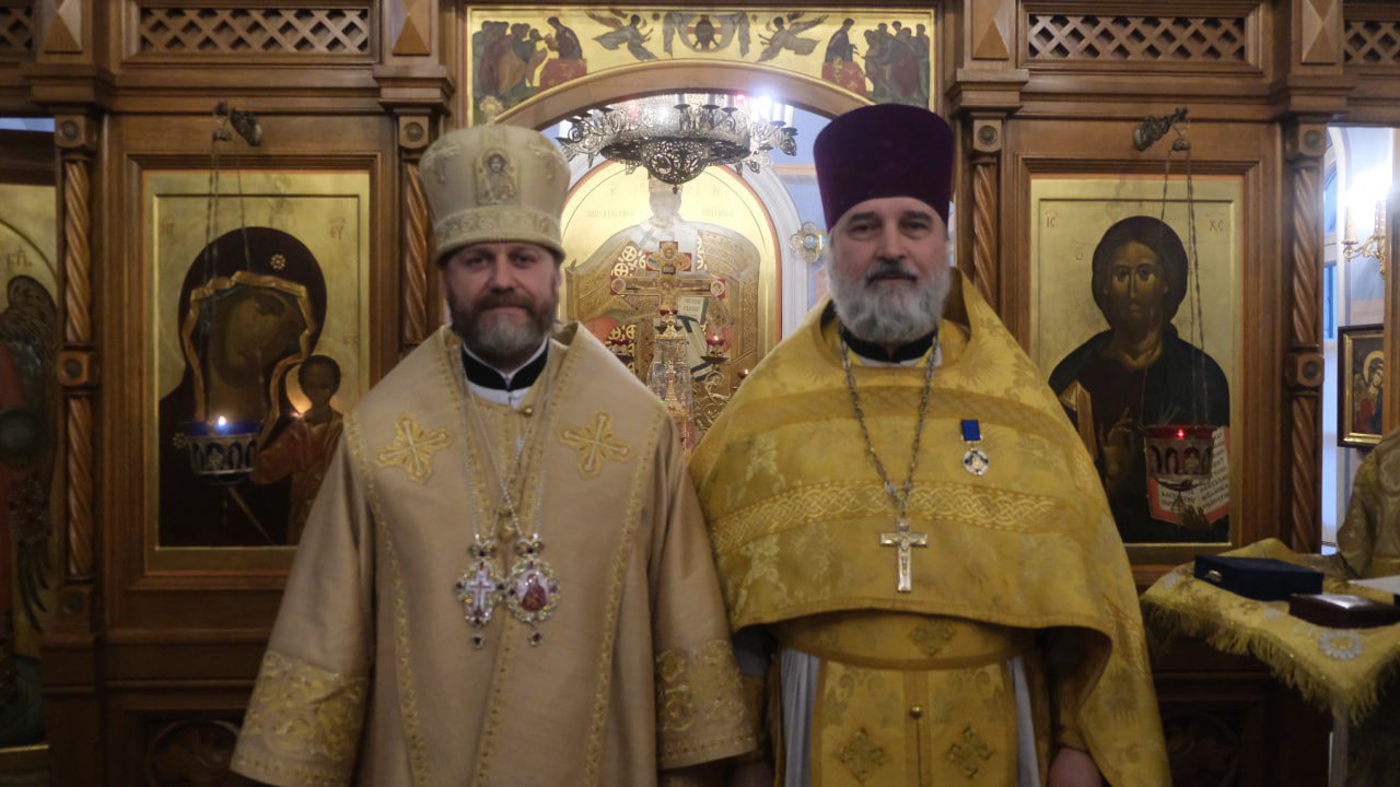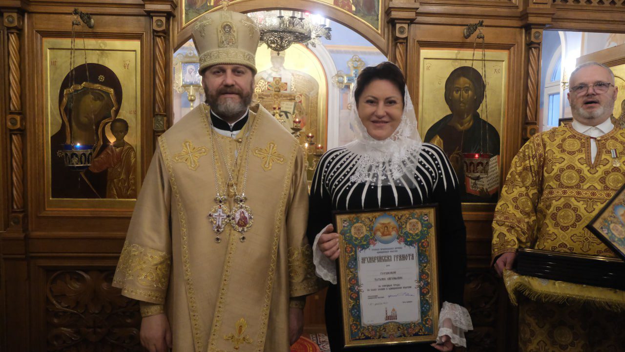 Затем состоялось награждение за усердные труды и в связи с 60-летием клирика Александро-Невского храма иерея Александра Королева и ктиторов, потрудившихся над благоукрашением и росписью внутреннего пространства храма. Также, Владыка почтил сотрудников прихода благодарственными грамотами.