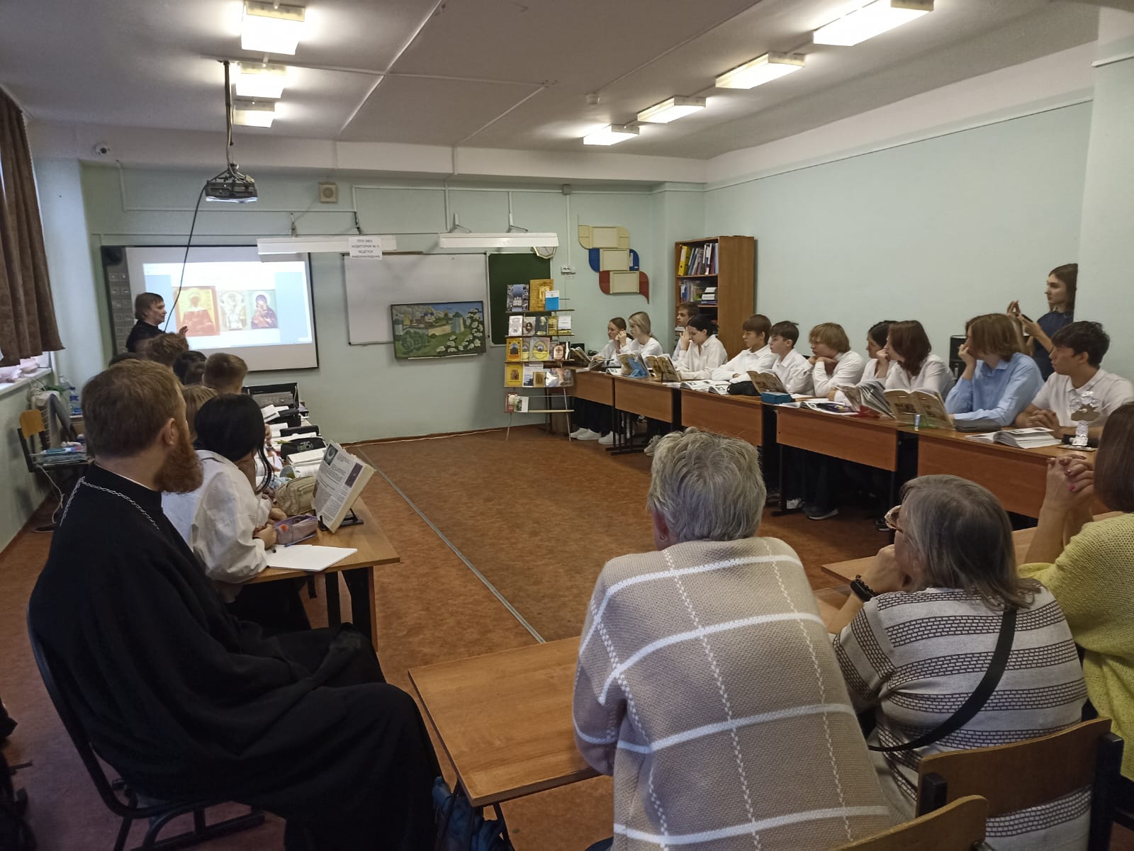 Далее был проведен открытый урок духовного краеведения Подмосковья,под руководством Зайцевой Евгении Борисовны для учеников 8 класса. Темой урока была “Икона – произведение искусства или нравственный облик христианина’.