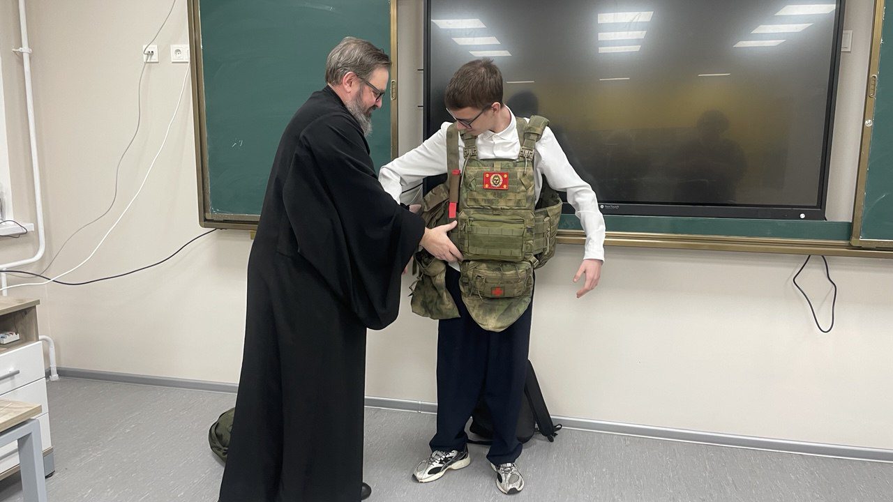 Для наглядности и информации отец Павел принес с собой то, что сопровождает священника при выполнении им своих богослужебных обязанностей – сумку со всем необходимым для совершения в т.ч. и Таинств, а также средства индивидуальной бронезащиты. В конце мероприятия желающие могли примерить военное снаряжение, в котором нашим воинам приходится выполнять боевые задачи.