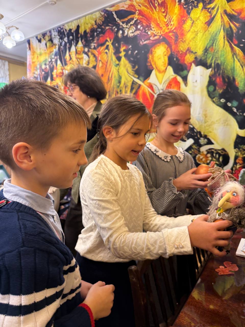 Посмотрели кукольное представление по пушкинской “Сказке о рыбаке и рыбке”. А потом получили на память сувениры, которые напомнят о пребывании в старинной усадьбе.