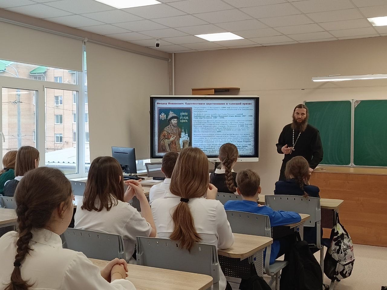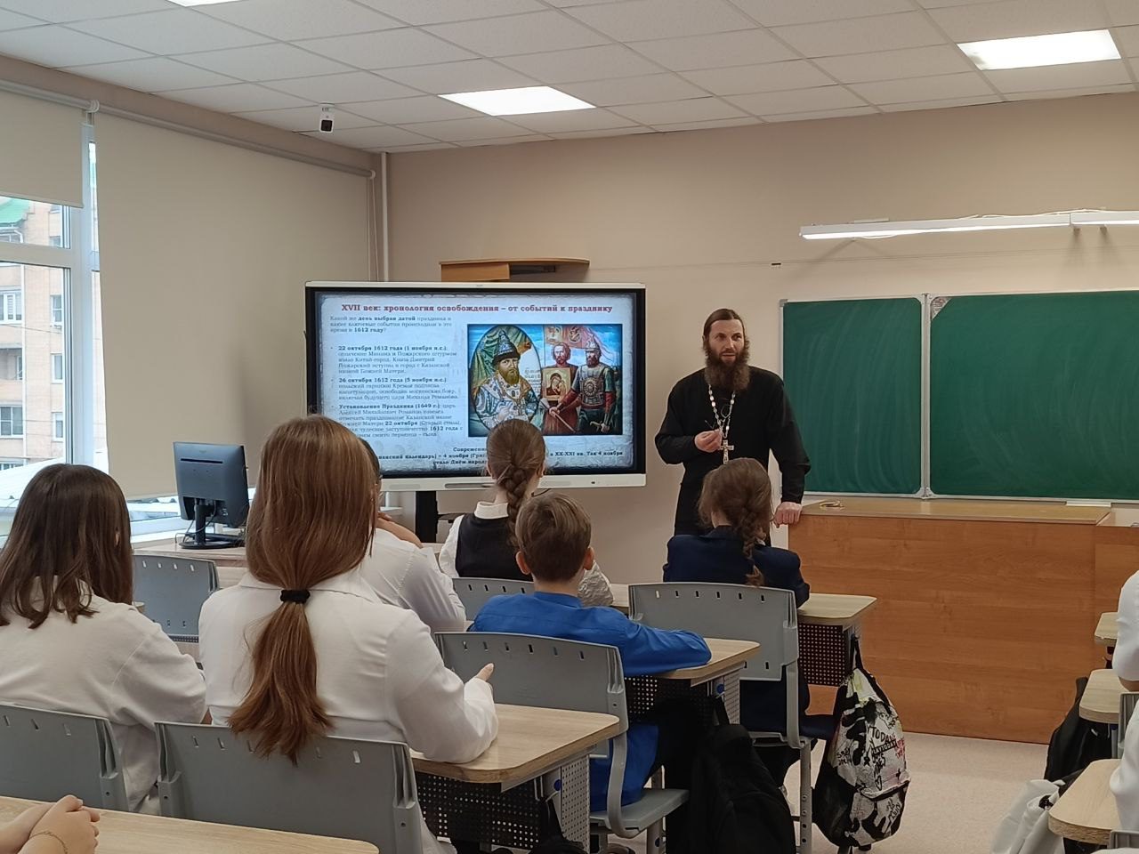 В ходе беседы с учениками гимназии отец Александр рассказал о том, как понимается идея единства в традиции Русской православной церкви. Особое внимание он уделил истории Казанской иконы Божией Матери, сыгравшей важную роль в событиях Смутного времени. Также он рассказал ученикам о подвиге Патриарха Гермогена, чьи проповеди и стойкость в вере стали примером исповедальной любви к Отечеству и вдохновили народ на его защиту.