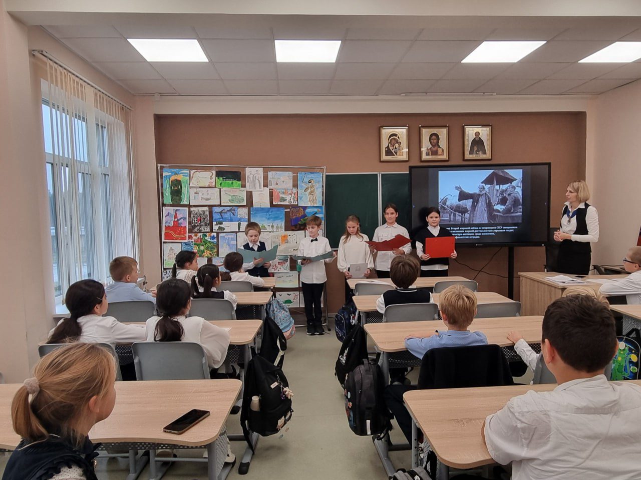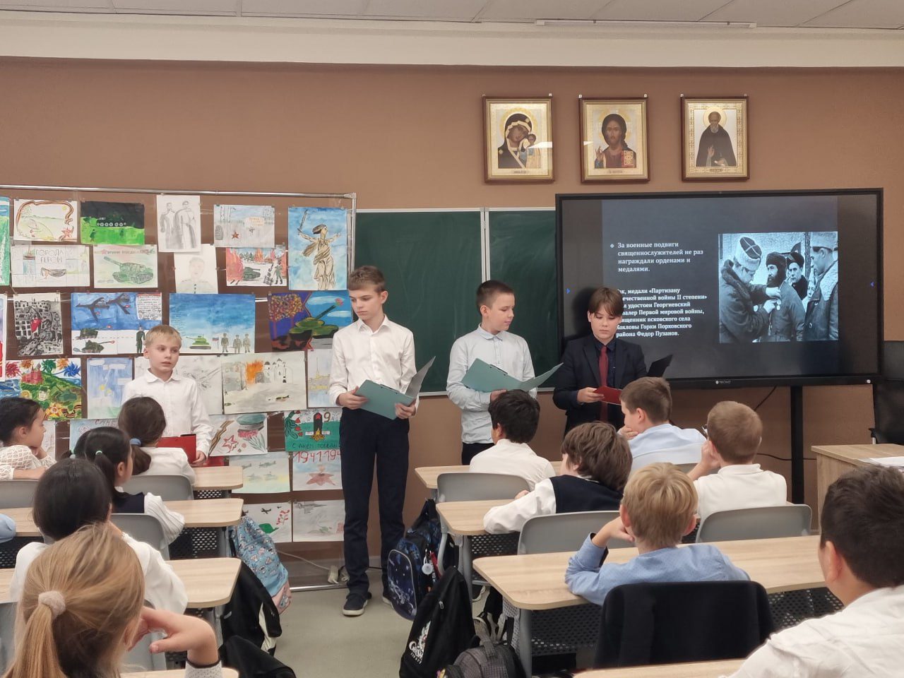 С 21.10 по 25.10 в Костровской средней школе, в рамках проведения районных Рождественских образовательных чтений «80-летие Великой Победы: память и духовный опыт поколений», прошла Неделя православной культуры среди четвертых и пятых классов, участие в которой приняли около 80 учащихся. 1 ноября состоялся итоговый конкурс по трем номинациям: авторские стихи детей о войне, проекты: «Важные события и герои Великой Отечественной войны», «Вклад Русской православной церкви в Победу», рисунок. Членами жюри конкурса были: директор школы Шулепова Я.В., настоятель Никольского храма д. Мансурово протоиерей Вадим Сорокин и заместитель директора по воспитательной работе Пилипочкина Е.Л. Выступления учащихся длились два урока.