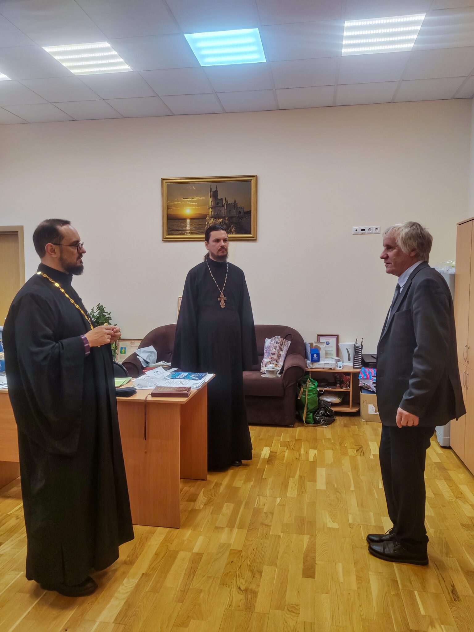 По завершении отец Алексий обратился к присутствующим со словами наставления, после чего духовенство пообщалось с директором школы В. М.Борькиным и педагогами.