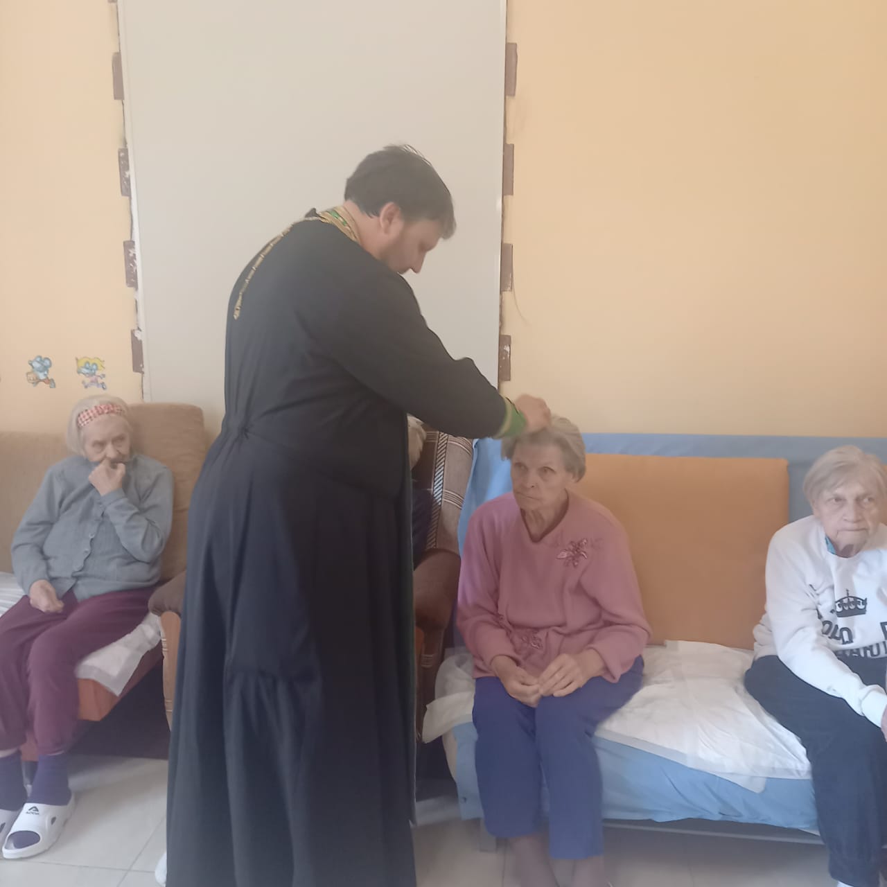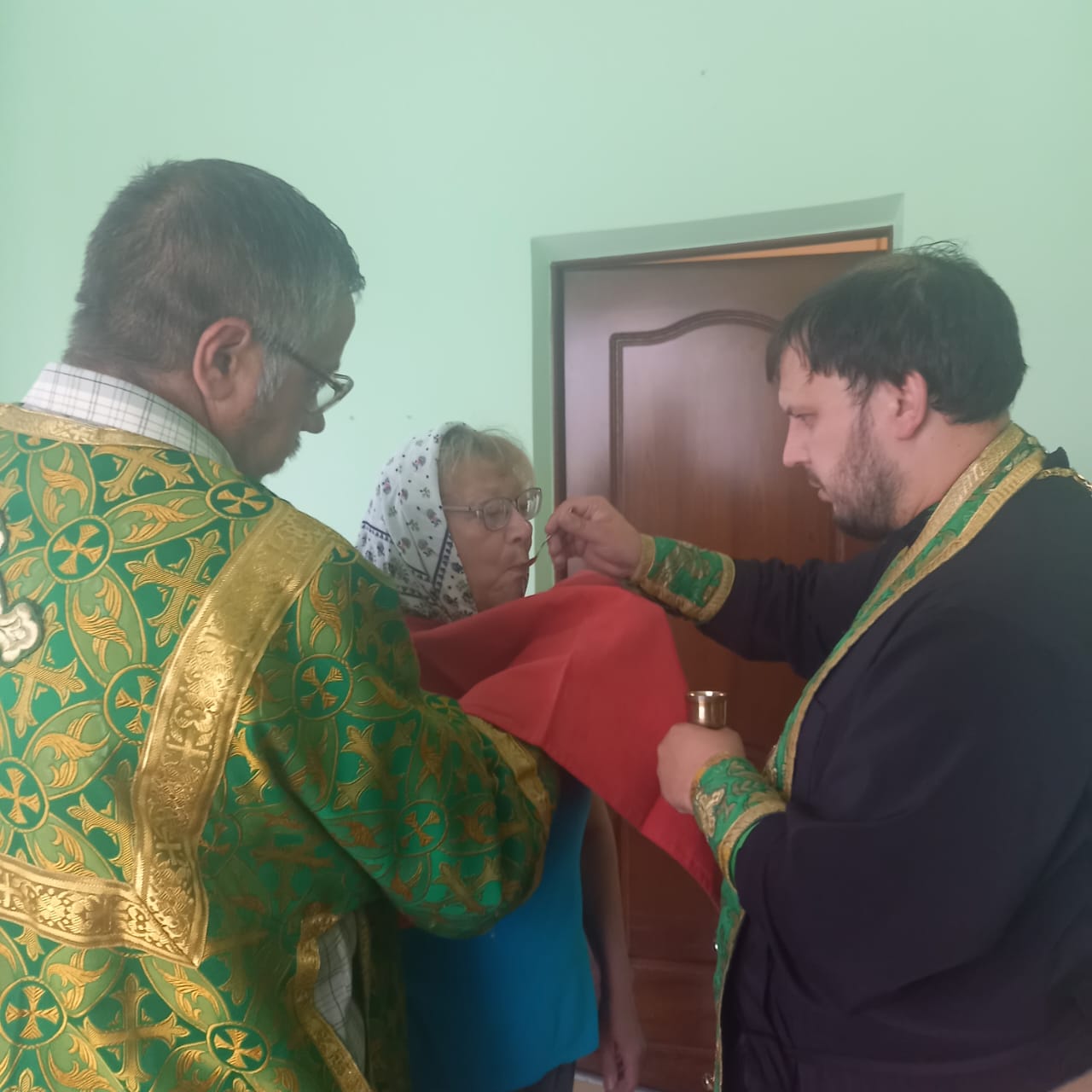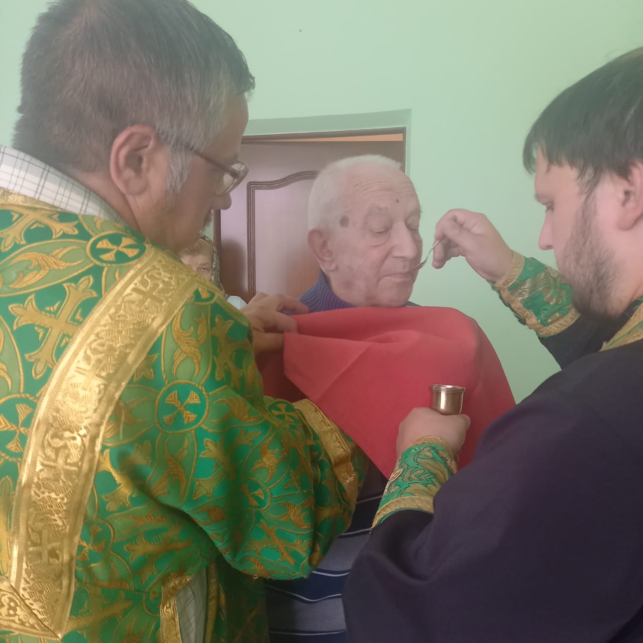 Священнослужитель поздравил всех с Праздником Пятидесятницы и причастил Святых Христовых Таин сотрудников пансионата и их подопечных.