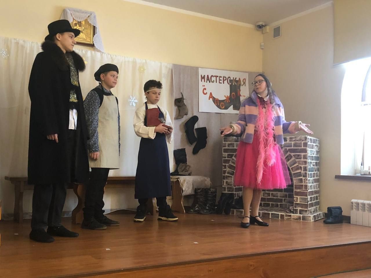 Продолжила концерт средняя группа с поэтическим мини-спектаклем «Рождество». Театральная студия представила постановку «Красные сапожки». На праздник пришли Дед Мороз и Снегурочка, которые подарили детям сладкие подарки и поиграли вместе с ними в новогодние игры.