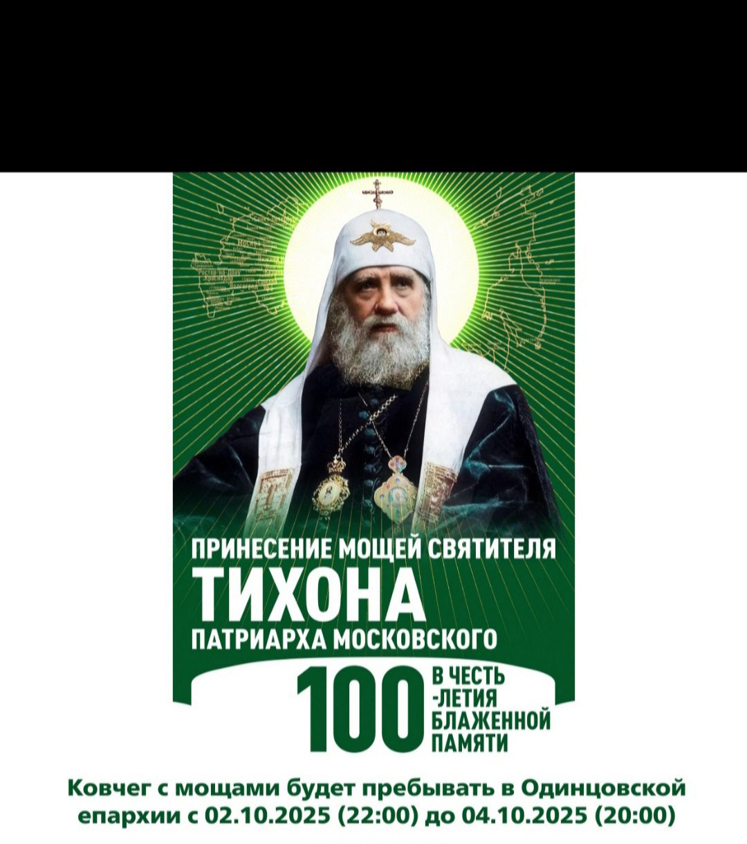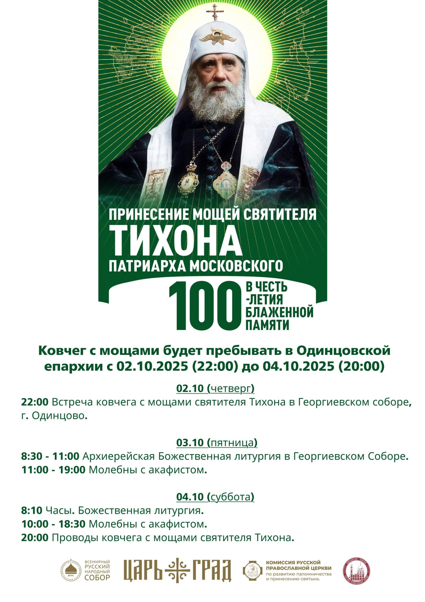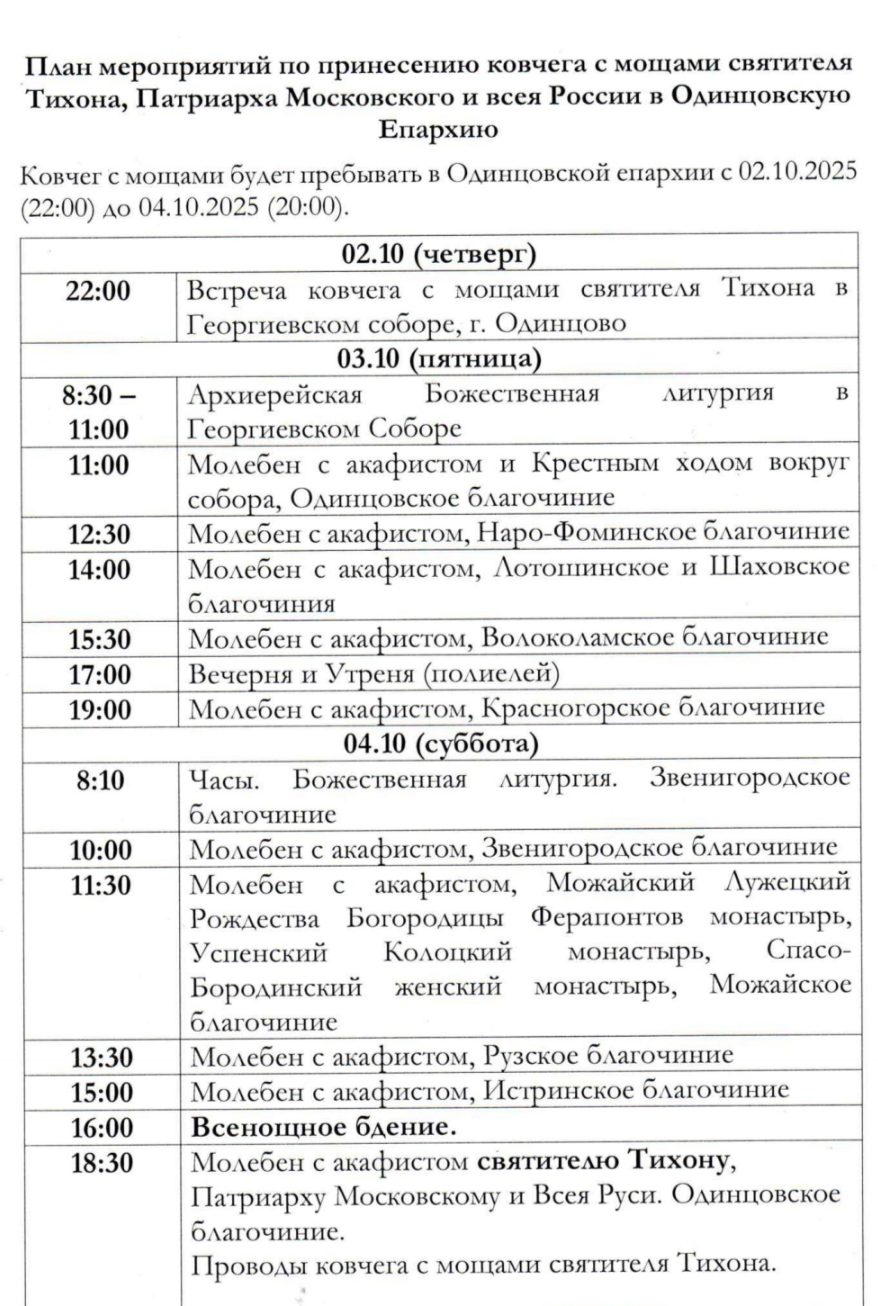 В Одинцовской епархии ковчег с мощами святителя Тихона будет пребывать со 2 по 4 октября. Помолиться и приложиться к мощам святителя Тихона можно в Георгиевском кафедральном соборе (г. Одинцово, Можайское шоссе, д.57) в следующие дни: