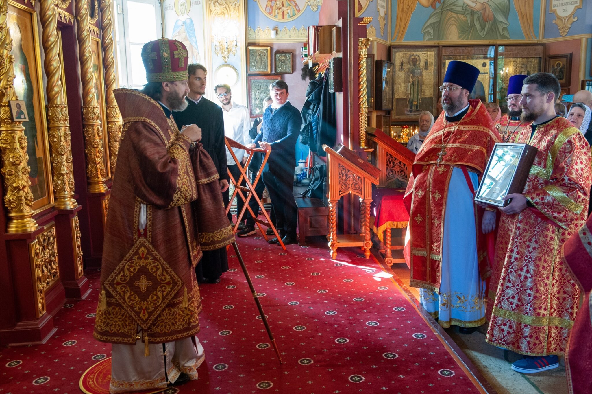 Настоятель Иоанно-Предтеченского храма протоиерей Александр Орлов передал владыке от прихода образ Божией Матери «Всех скорбящих Радость».