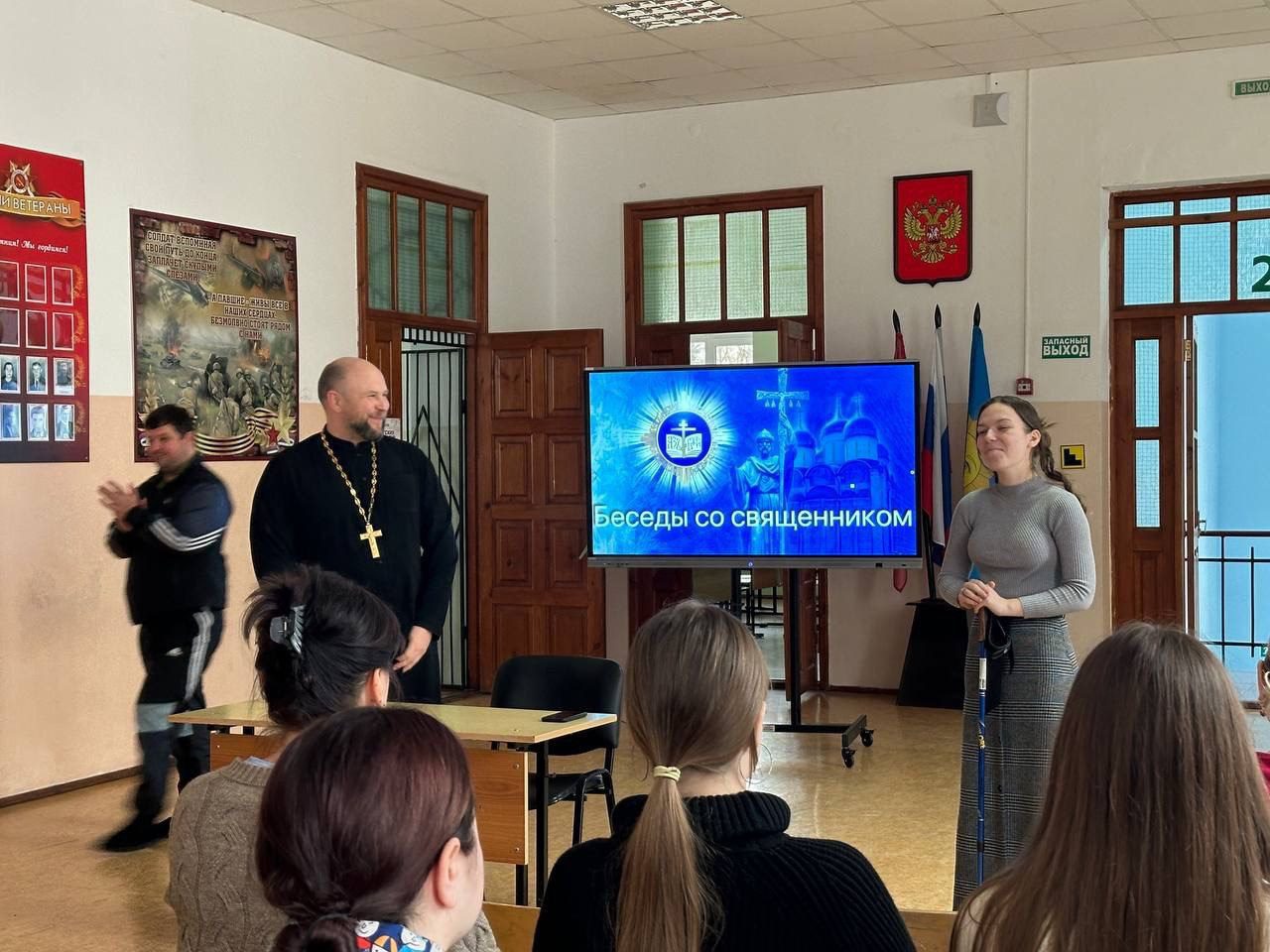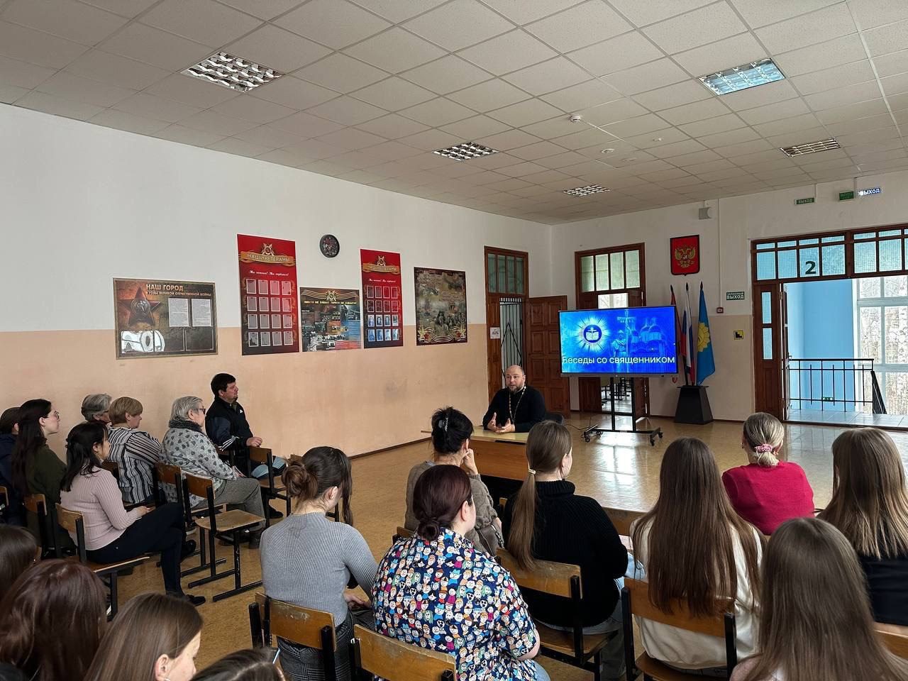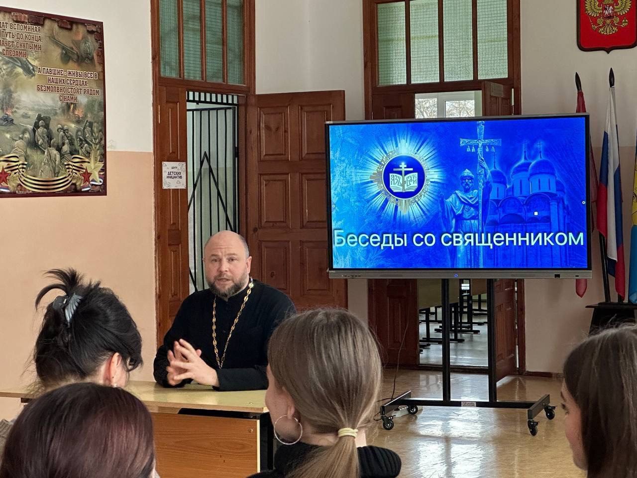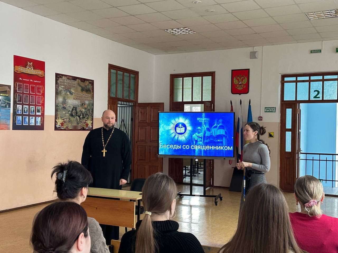 21 ноября в рамках акции «Задай вопрос священнику» в Дедовской СОШ N 1 состоялась встреча благочинного Истринского округа настоятеля Георгиевского храма г. Дедовска протоиерея Сергия Еремина с учениками и преподавателями школы. В беседе приняли участие и представители молодежного движения Георгиевского храма. В ходе встречи отец Сергий отвечал на вопросы, которые волновали преподавателей и ребят.