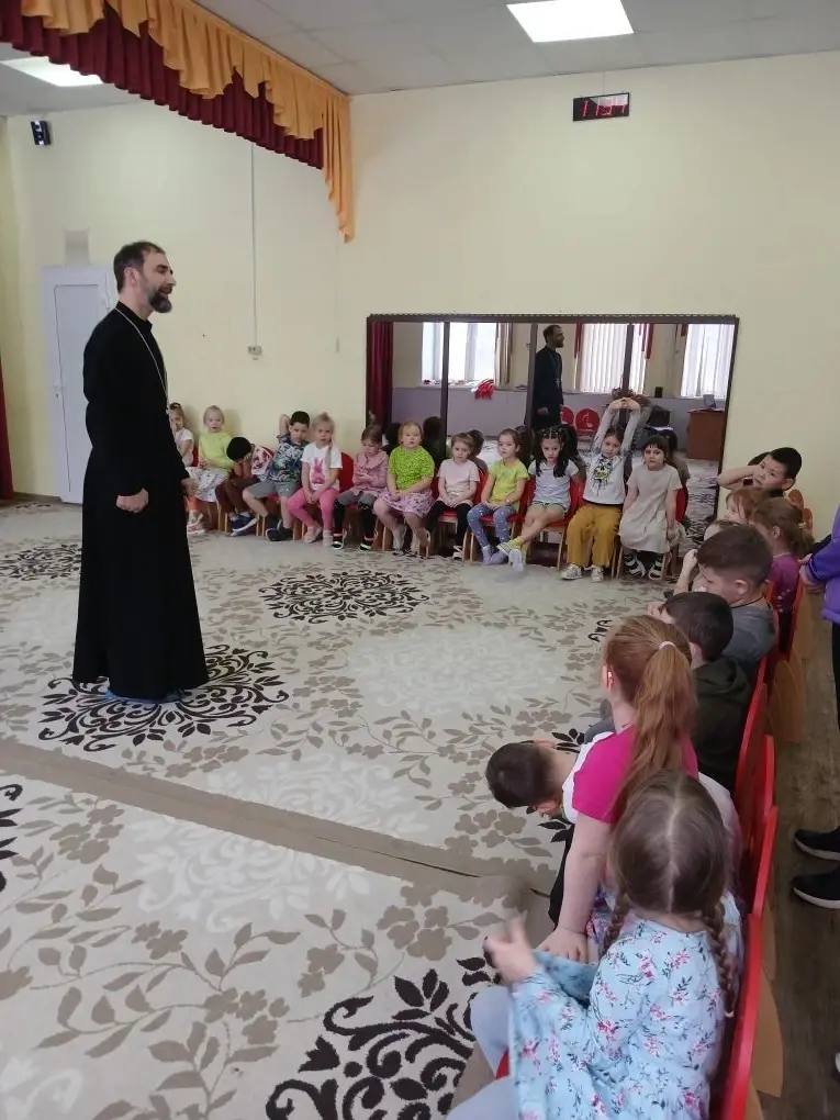 26 февраля клирик Георгиевского храма священник Алексий Кравченко провёл беседу в детском саду 17 “Семицветик” с дошкольной и старшей группами ребят. Темой встречи была подготовка к празднику Пасхи, о том, как мы стараемся начать исправление своего нехорошего поведения, о молитве и послушании старшим. В заключение дети задали вопросы и были приглашены на Пасхальной неделе в храм на экскурсию и чаепитие.