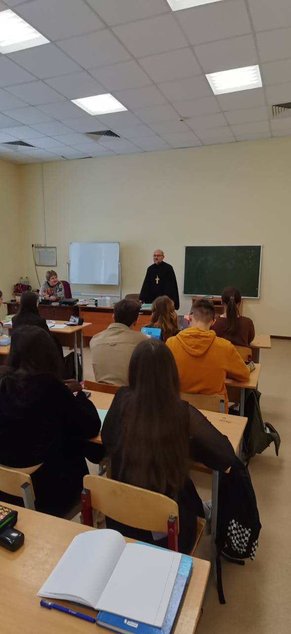 15 февраля в СОШ № 4 г. Наро-Фоминска состоялась беседа клирика Никольского собора протоиерея Алексия Марченкова с учащимися 10 класса. Обсудили явление религиозного экстремизма. В ходе встречи было отмечено, что лучшей прививкой от экстремизма является глубокое знание и понимание своих духовных корней и традиций, как религиозных, так и культурных. В конце беседы о. Алексий ответил на поступившие от учеников вопросы.