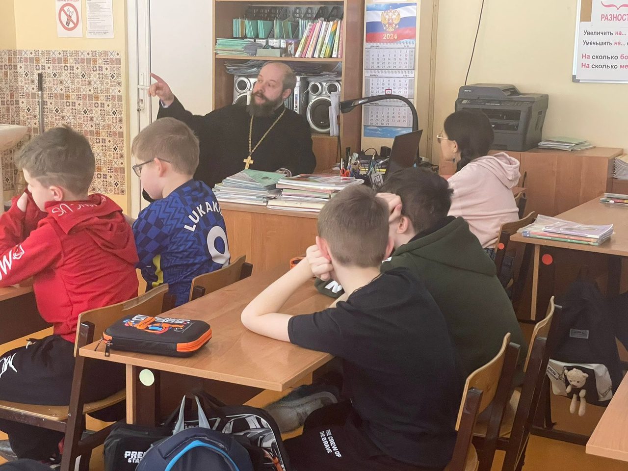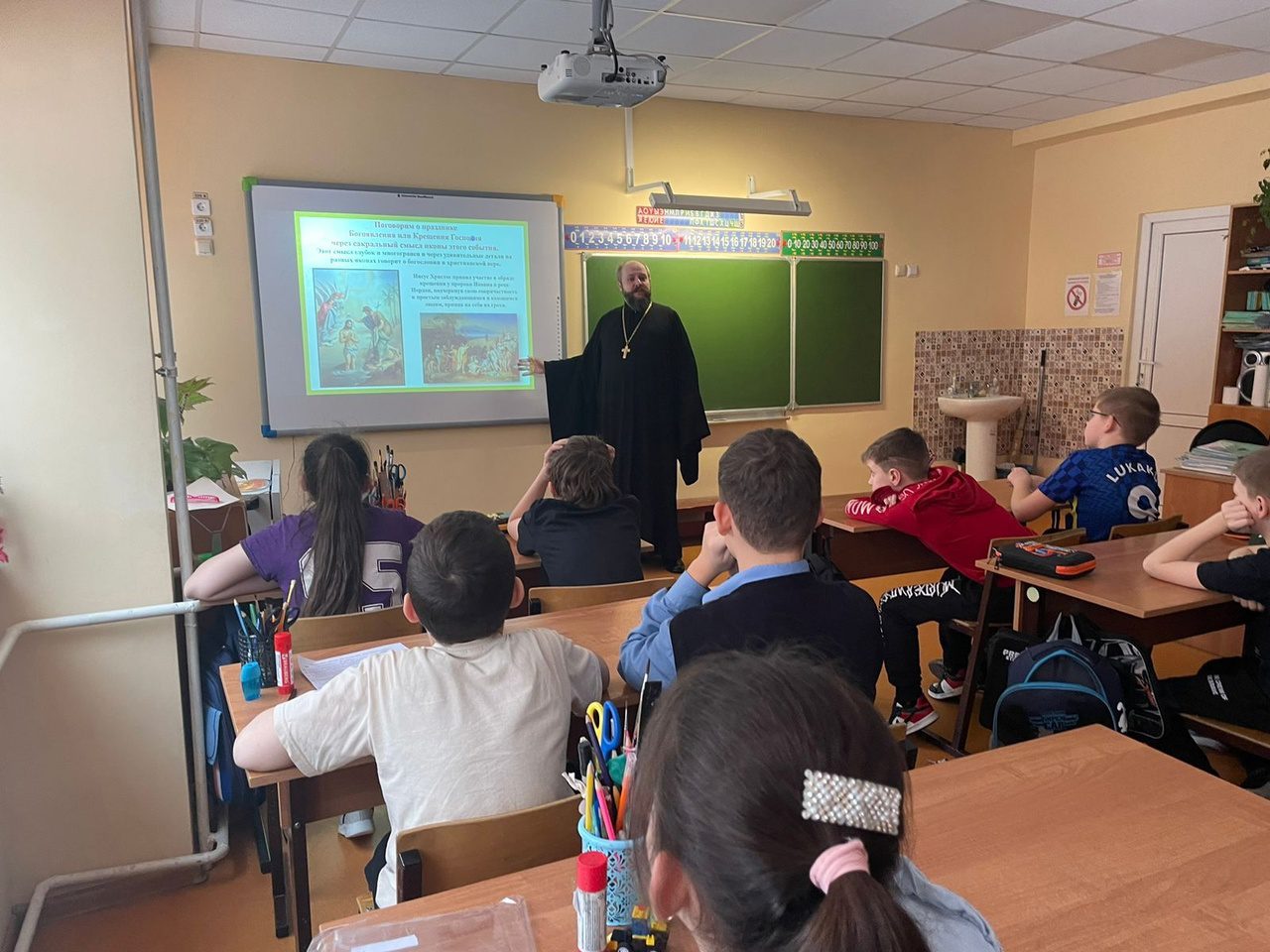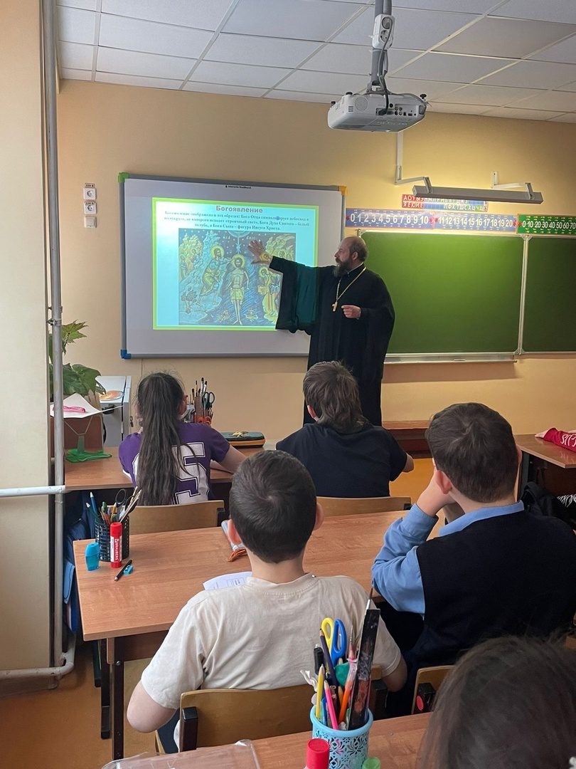25 января по приглашению православного педагога-психолога Любови Георгиевны Овды заместитель благочинного Волоколамского округа священник Михаил Завитаев провел очередное занятие с учащимися 4 класса Волоколамской школы-интернат на тему: «Крещение Господне: история праздника, иконография, традиции». Несмотря на сложную тему, в ходе двухчасовой встречи ребята проявили интерес и увлеченно обсудили с батюшкой презентацию к уроку.