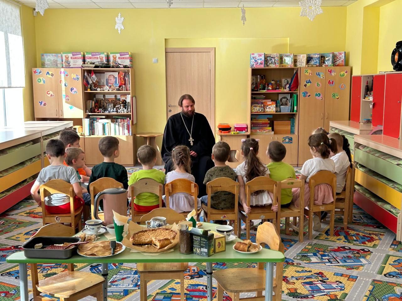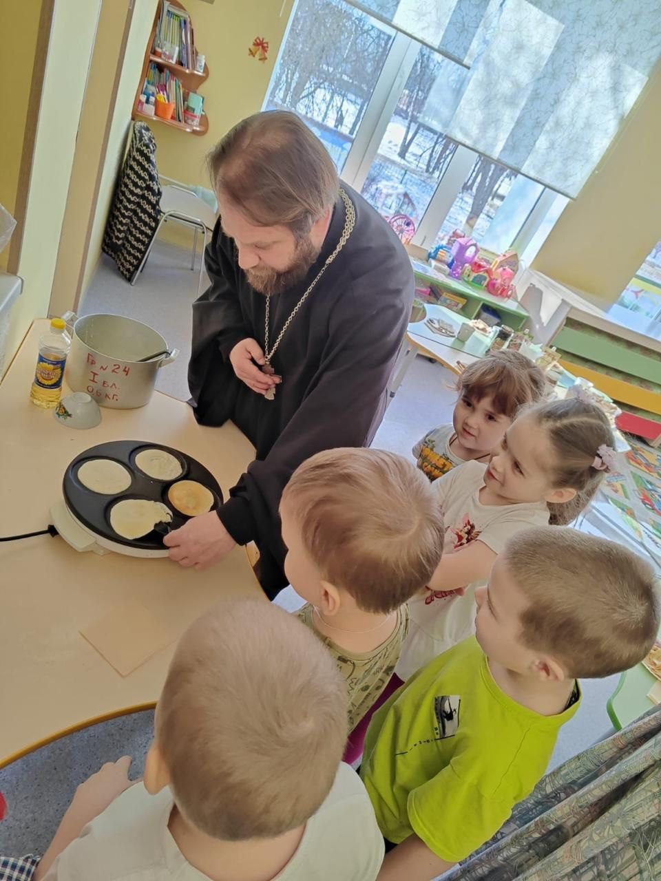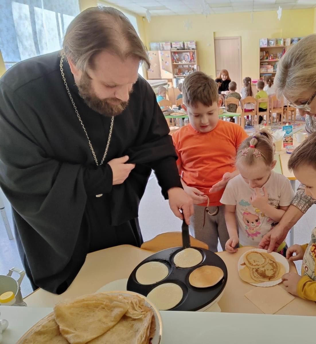 25 февраля в МОУ «Гимназия N 1. Дошкольное отделение №9” праздновали Масленицу. На праздник был приглашён ответственный за взаимодействие с дошкольными образовательными организациями Волоколамского благочиния иерей Димитрий Пищерков. Священник пообщался с детьми о Масленице и подготовке к Великому Посту. Дети пели песни и водили хороводы в которых нашлось место и для отца Димитрия. Батюшка участвовал вместе с детьми в мастер-классе по приготовлению блинов, которые вместе съели за чаепитием.