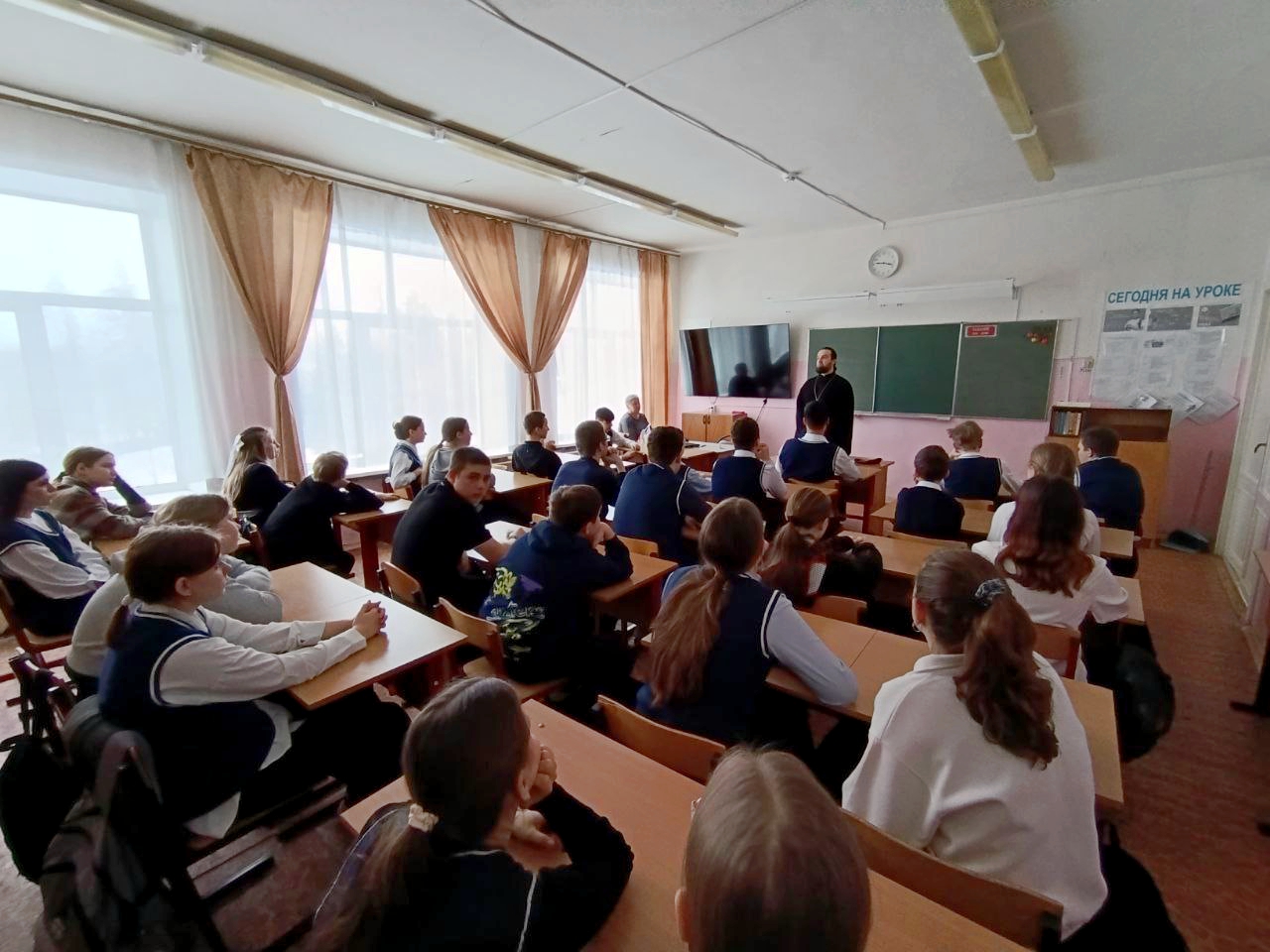 В тот же день настоятель Покровского храма села Богородское иерей Виталий Бровко провел с учениками пятых, шестых и седьмых классов Беляногорской СОШ беседу о новомучениках и исповедниках Рузских. Вместе со школьниками священник рассмотрел феномен мученичества вообще и подробно разобрал период гонений на Церковь в России в начале XX века на примере жизнеописания священномученика Николая Соколова. Уроженец Рузского уезда, выпускник Московской духовной семинарии, отец Николай многие годы служил в храмах Подмосковья, был благочинным церквей Верейского и Можайского районов, а в 1937 году принял мученическую кончину на Бутовском полигоне .