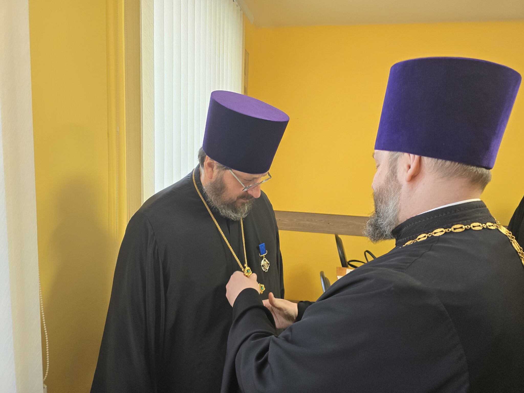 В начале встречи по благословению Архиепископа Красногорского и Одинцовского Фомы во внимание к трудам на благо Святой Церкви и в связи с 50-летием со дня рождения протоиерей Герман Григорьев удостоен Знака “Благодарность за помощь в созидании и устроении церковной жизни”. Зачитал поздравительный адрес юбиляру и вручил награду заместитель благочинного священник Михаил Завитаев. Духовенство Волоколамского округа пропело многолетие отцу Герману.