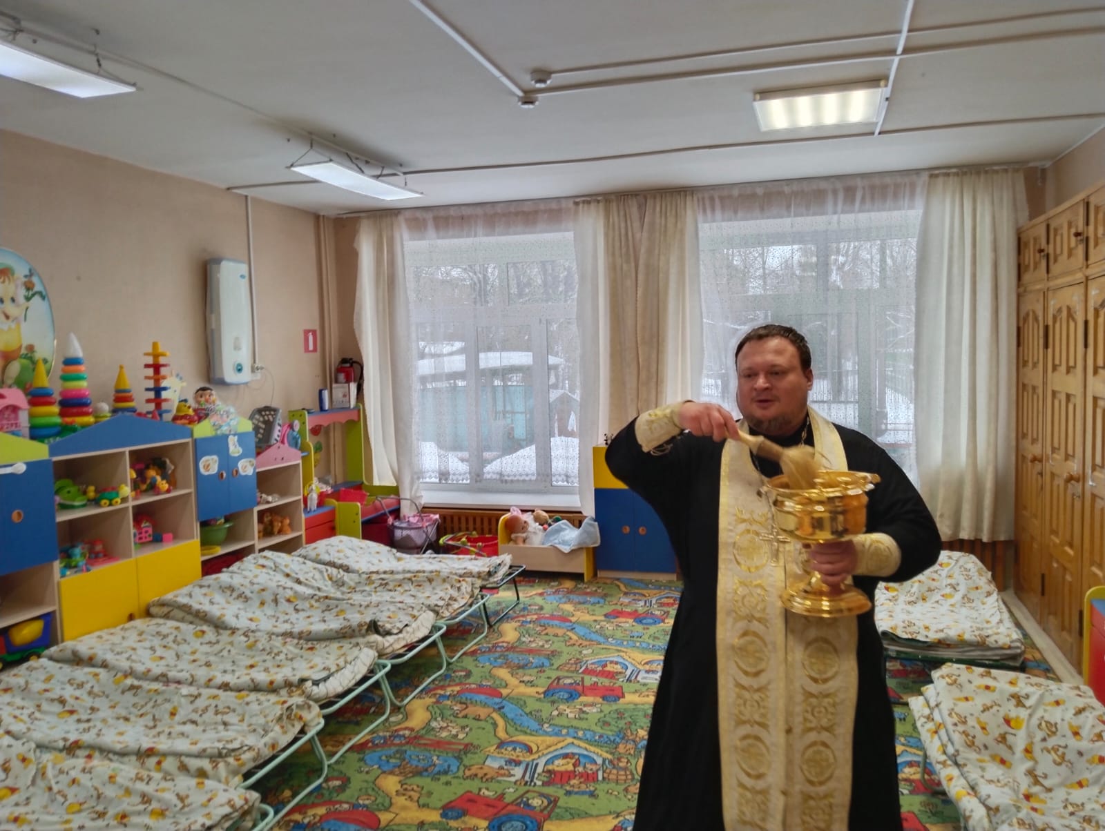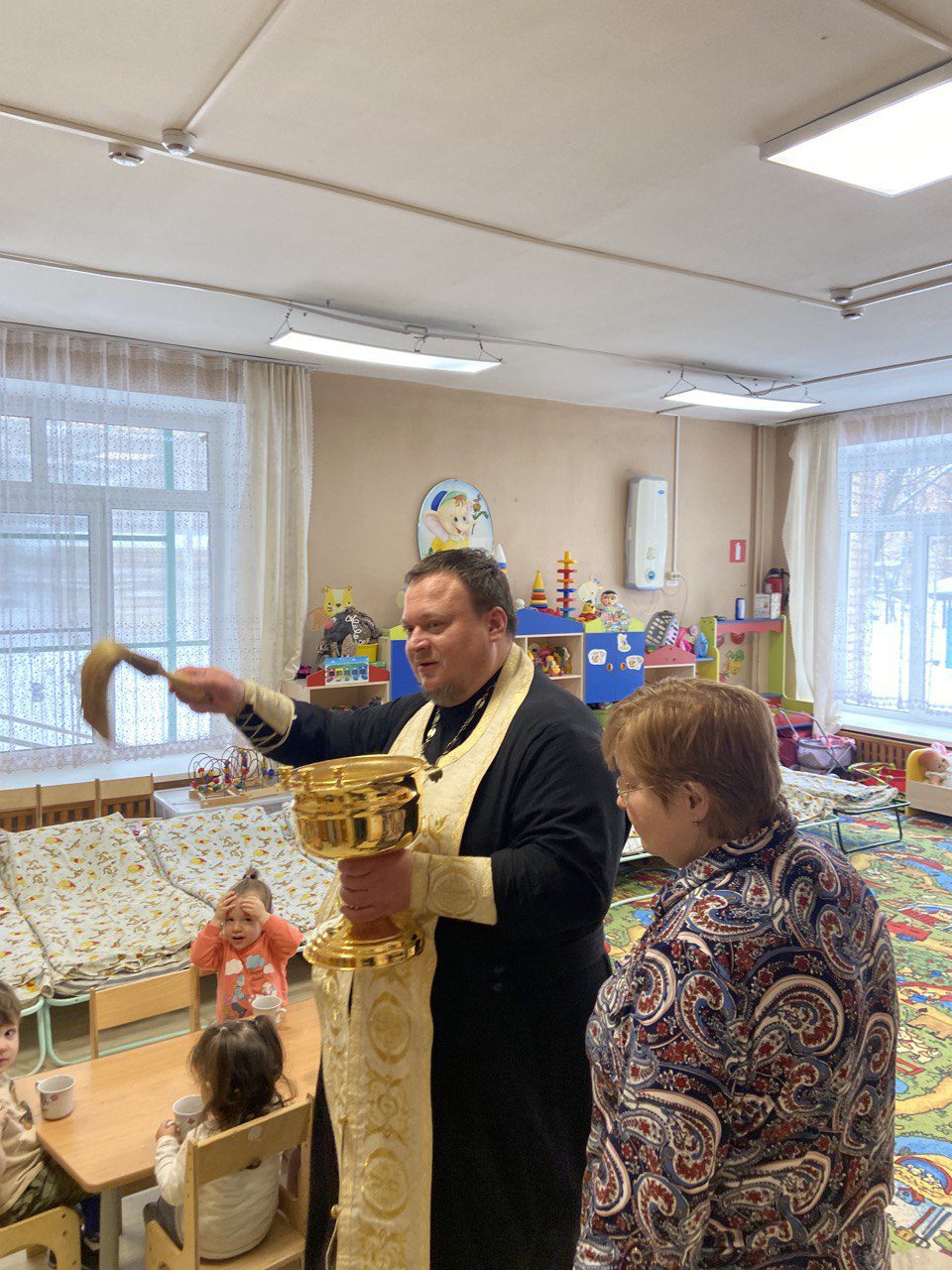 При участии сотрудников и администрации он совершил водосвятный молебен. По окончании молебна отец Вадим, не только окропил святой водой присутствующих, но и прошел по всем помещениям детского сада и освятил их.