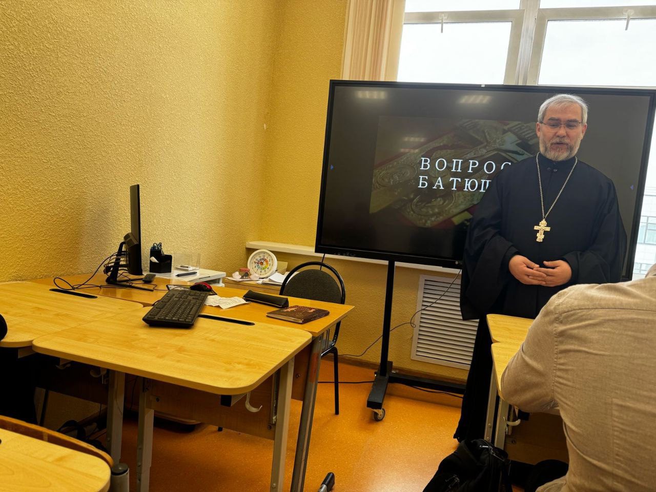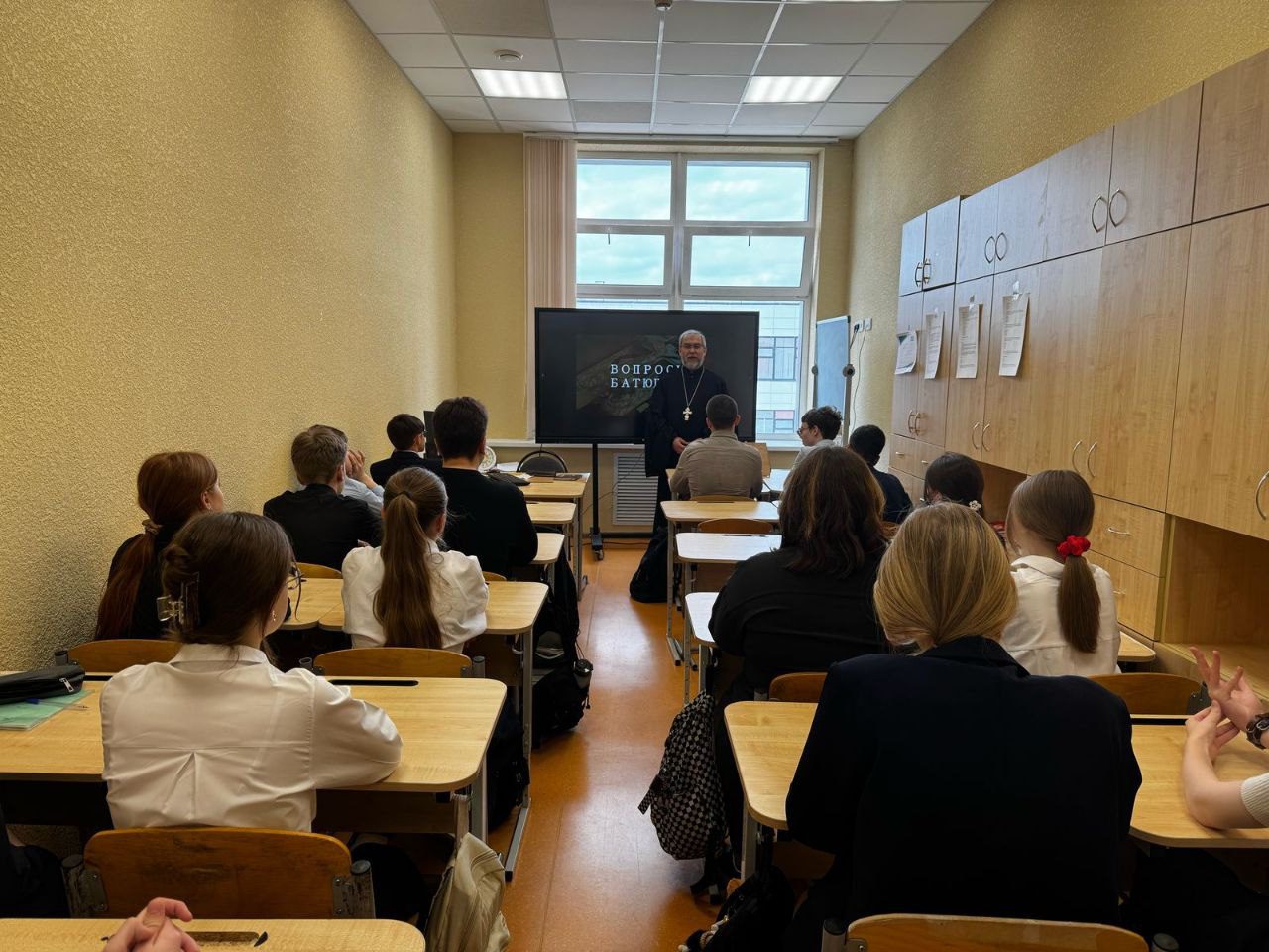 В понедельник, 31 марта по приглашению администрации МОУ «Лицей г. Истра», в рамках акции “Задай вопрос священнику” клирик Мироносицкого храма иерей Максим Сарыев провел беседу с учениками седьмого класса.
