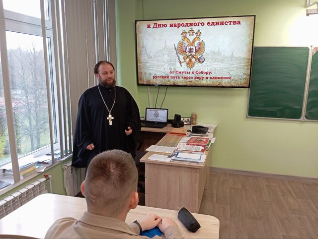 В беседе, посвящённой предстоящему Дню Народного Единства, священник рассмотрел исторические события Смутного времени, обратил особое внимание на духовный смысл праздника и роль Православной Церкви в деле объединения народа.