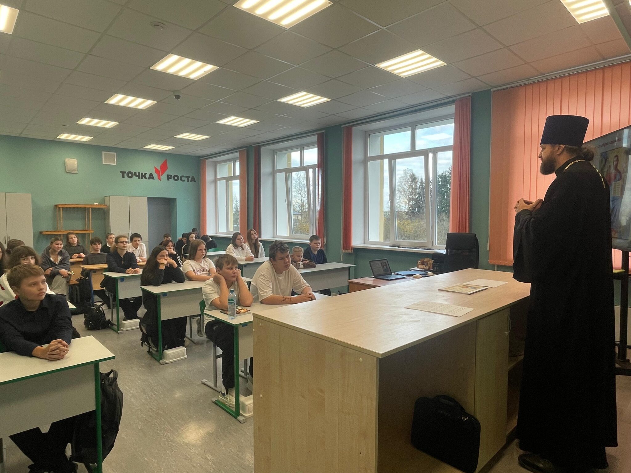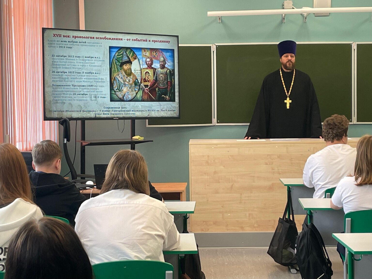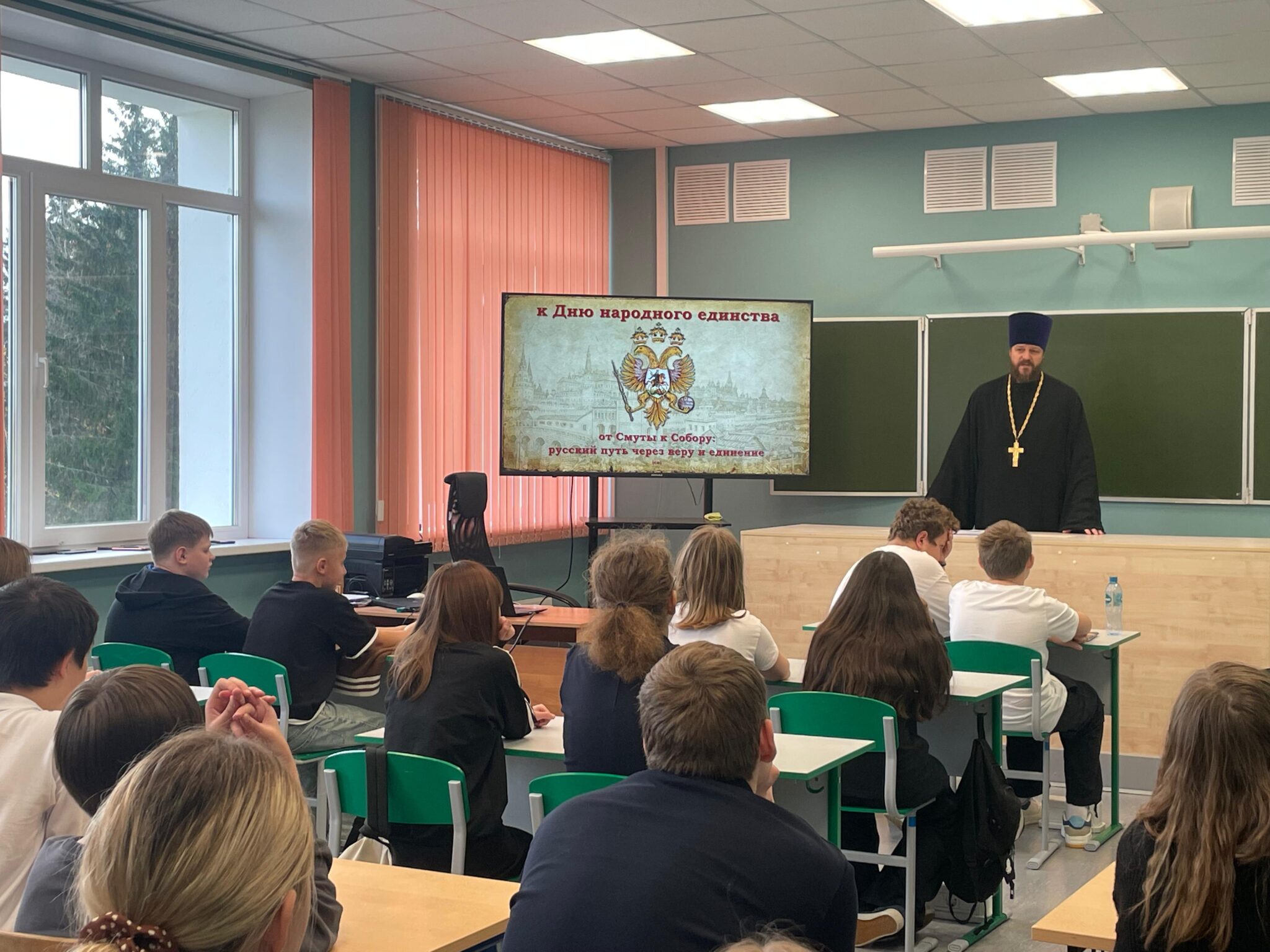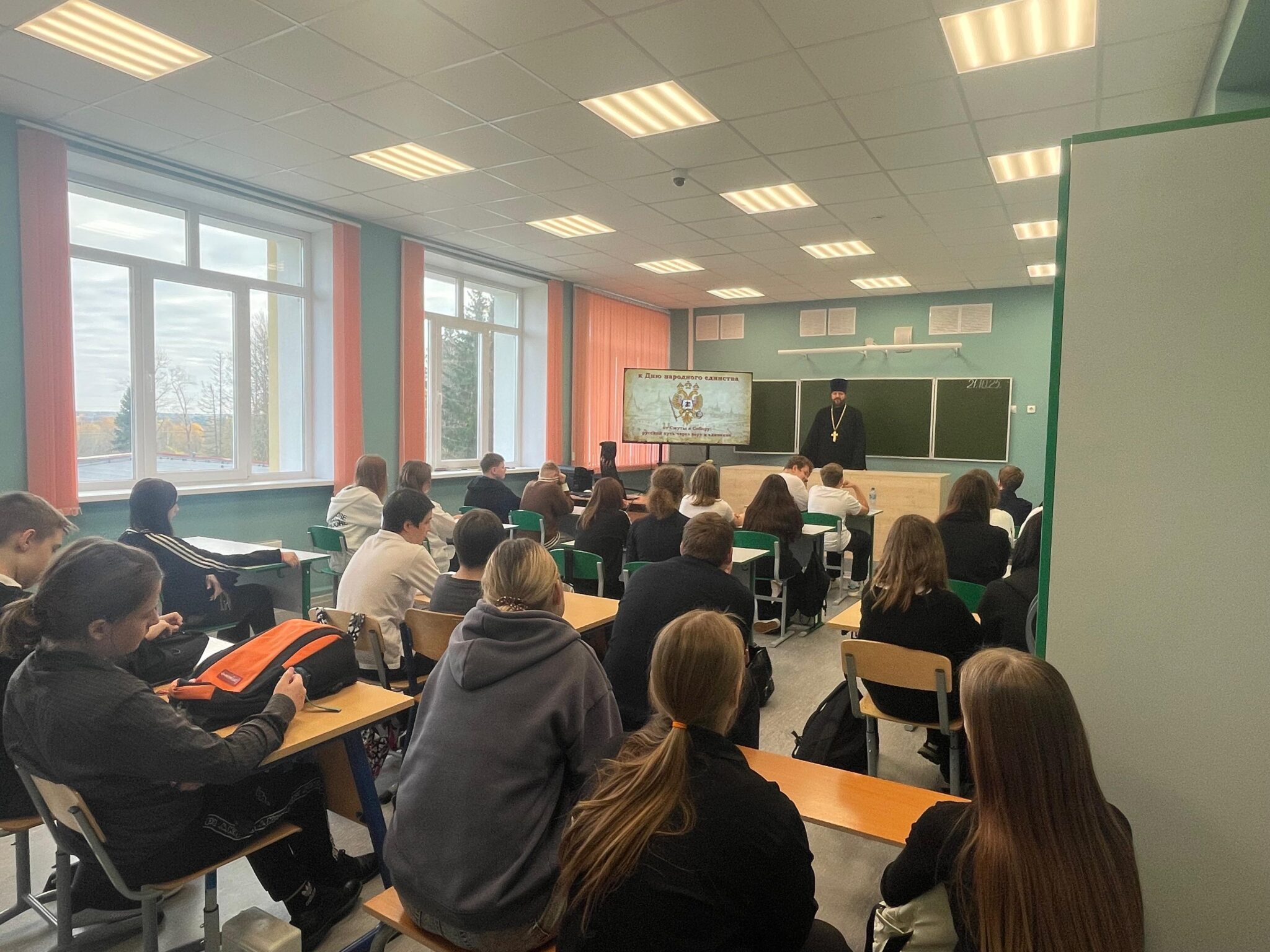 29 октября иерей Игорь Павлов, настоятель Никольского храма д.Амельфино, провел открытый урок среди 6-8 классов в Чисменской школе. Встреча приурочена к “Дню народного единства”. Кроме учеников, присутствовали преподаватели и заведующая учебной частью Зинаида Алексеевна Менджул.