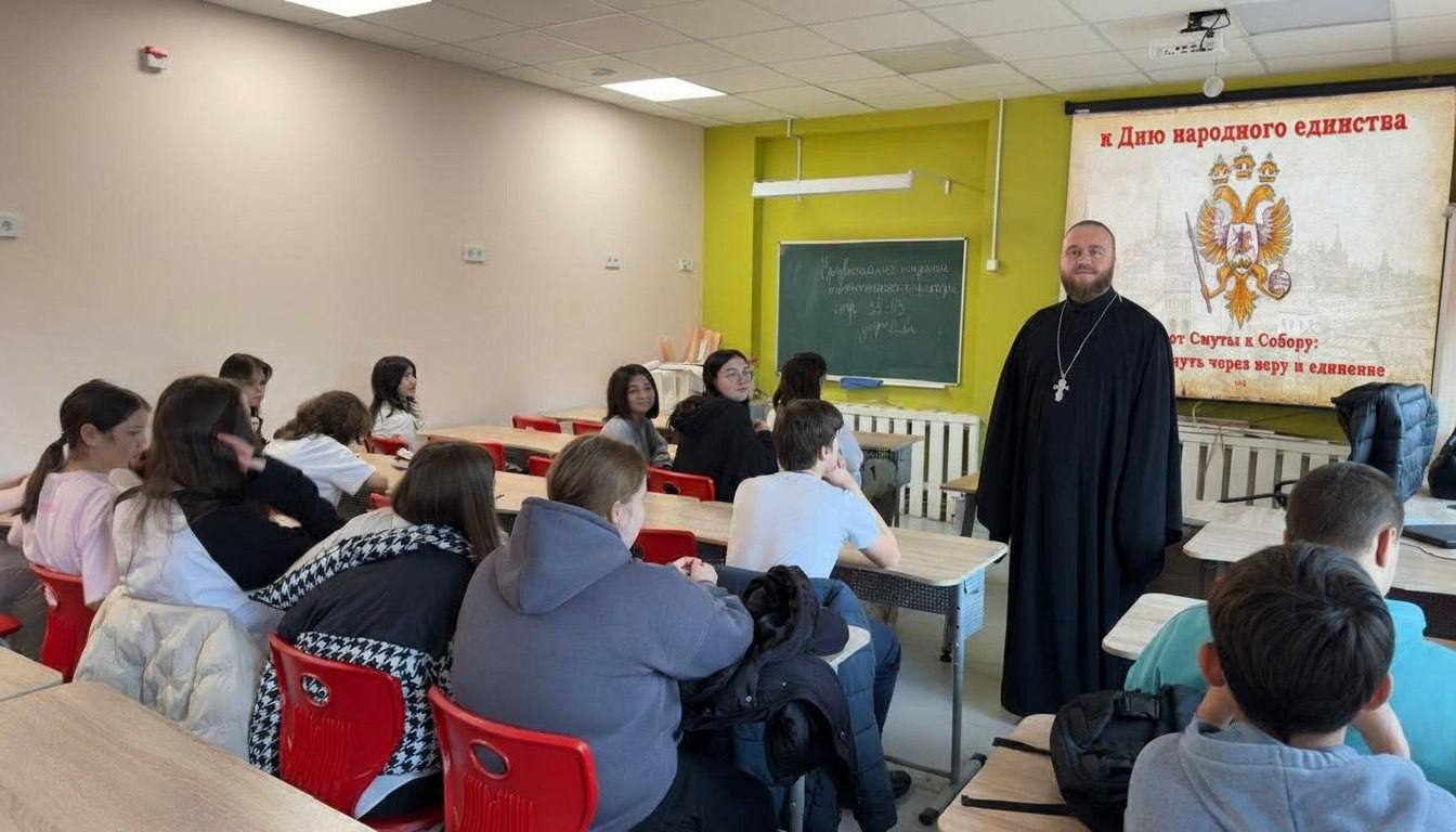 30 октября, в рамках акции “День народного единства”, состоялась встреча клирика Христорождественского храма г. Звенигорода священника Михаила Орманжи с учащимися 9-го класса Общеобразовательного отделения СОШ №2 им. М. А. Пронина г. Звенигорода.