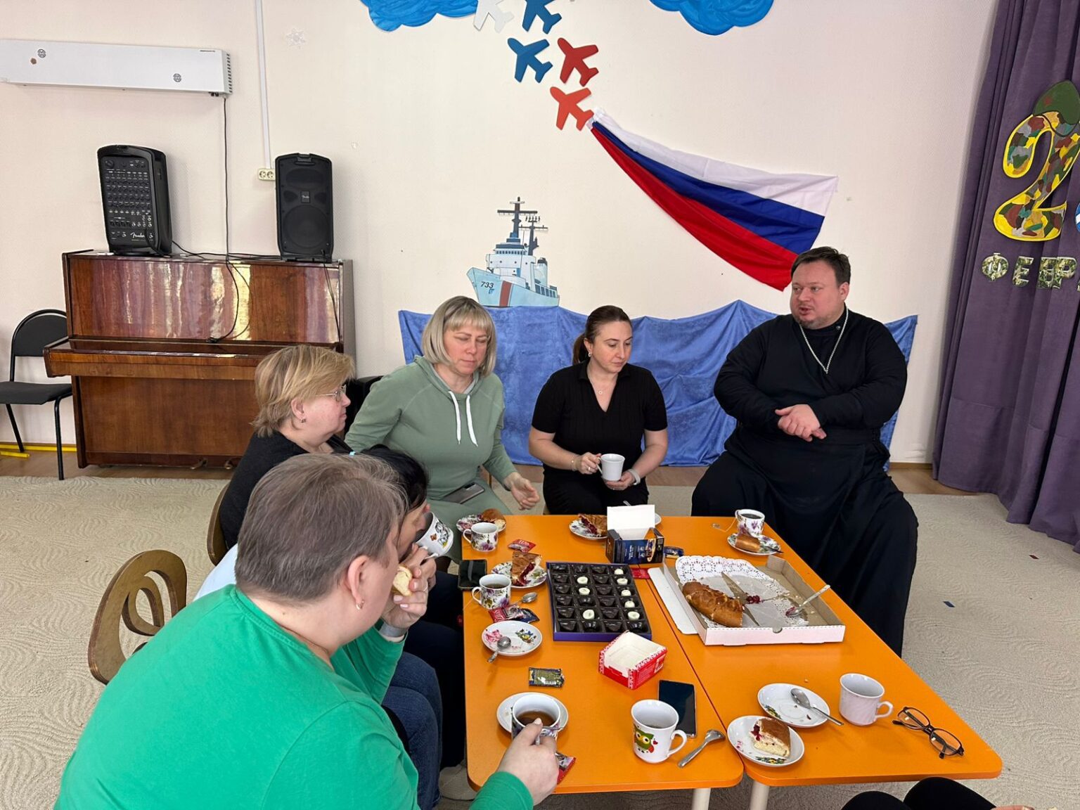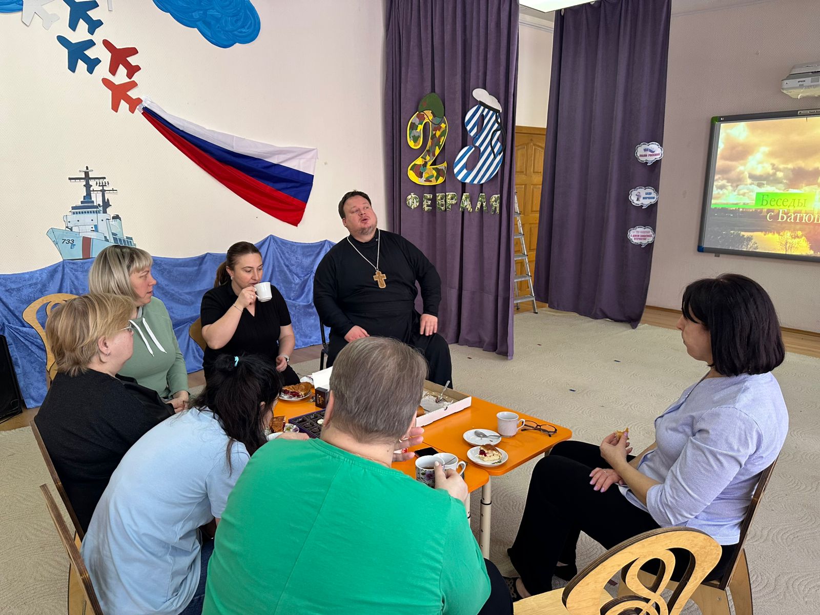 За чаепитием, священник Вадим Пименов рассказал о смысле и духовных аспектах поста, а также ответил на вопросы воспитателей.