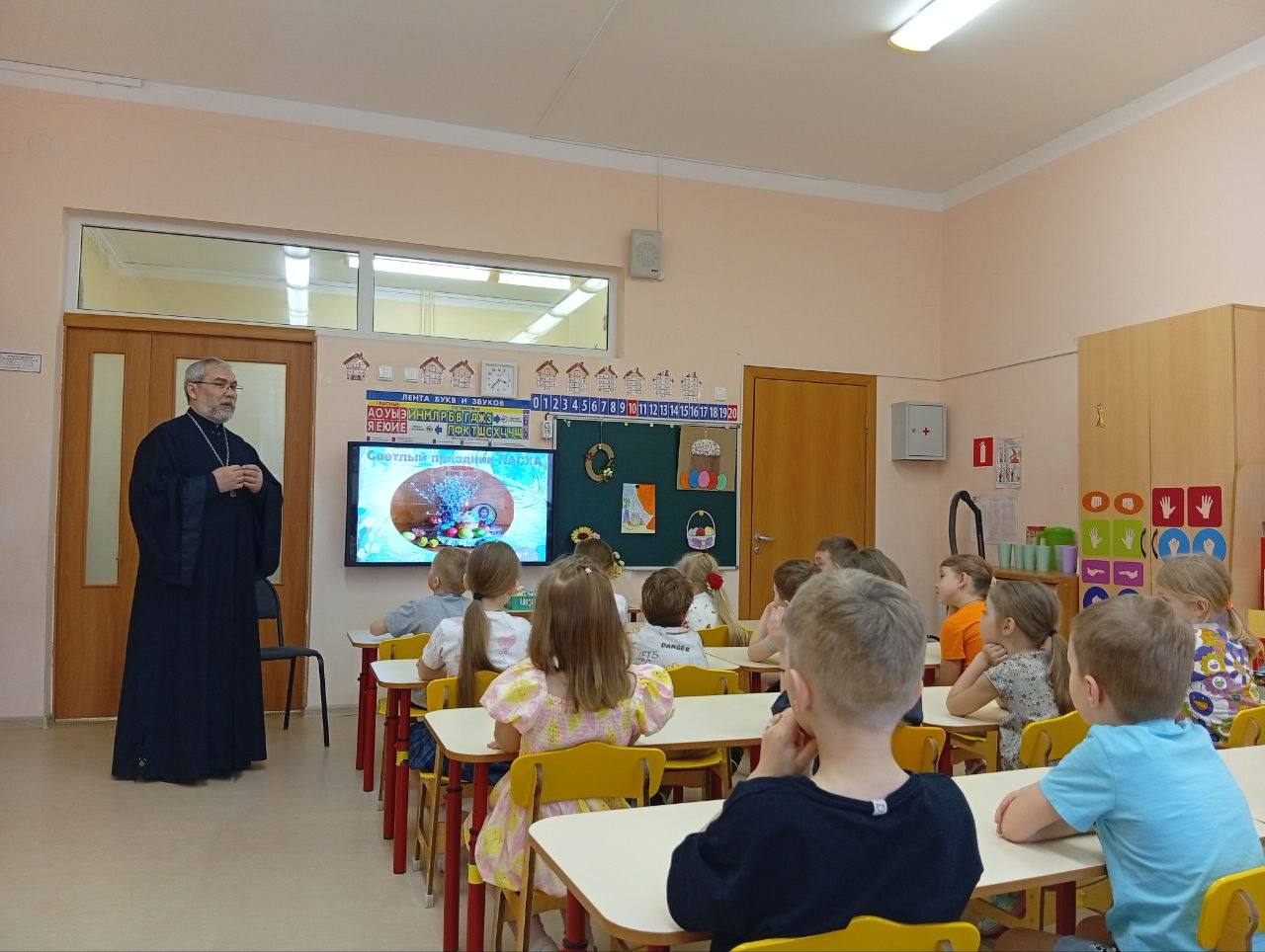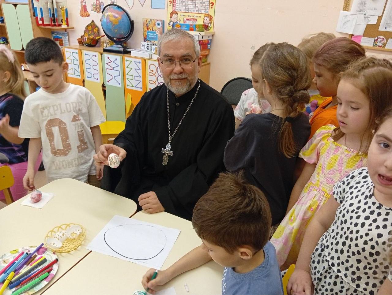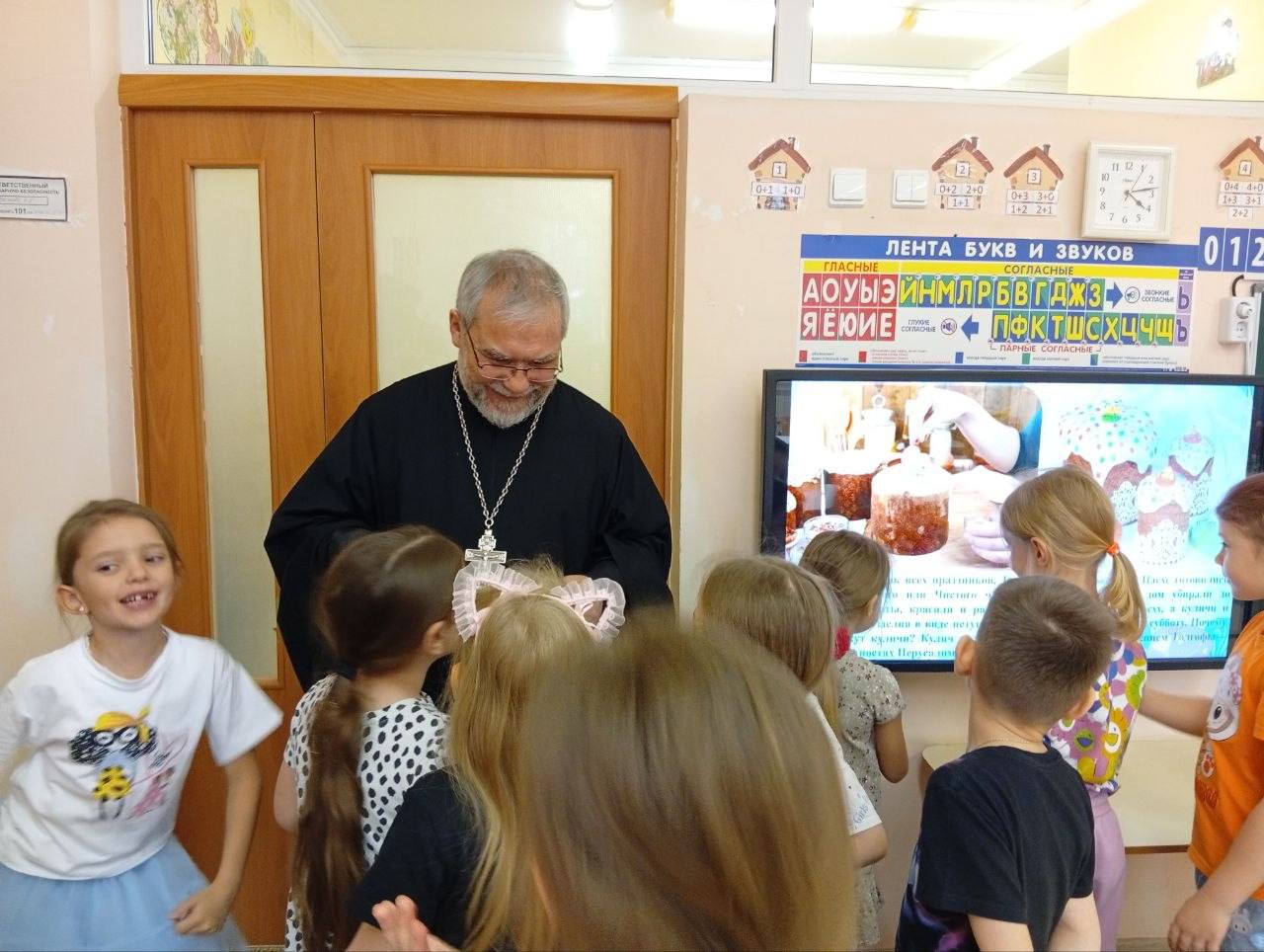 9 апреля в рамках реализации плана по духовно-нравственному воспитанию дошкольное отделение №18 Истринской средней общеобразовательной школы №3 имени М.Ю. Лермонтова посетил клирик Мироносицкого храма г. Истра священник Максим Сарыев.