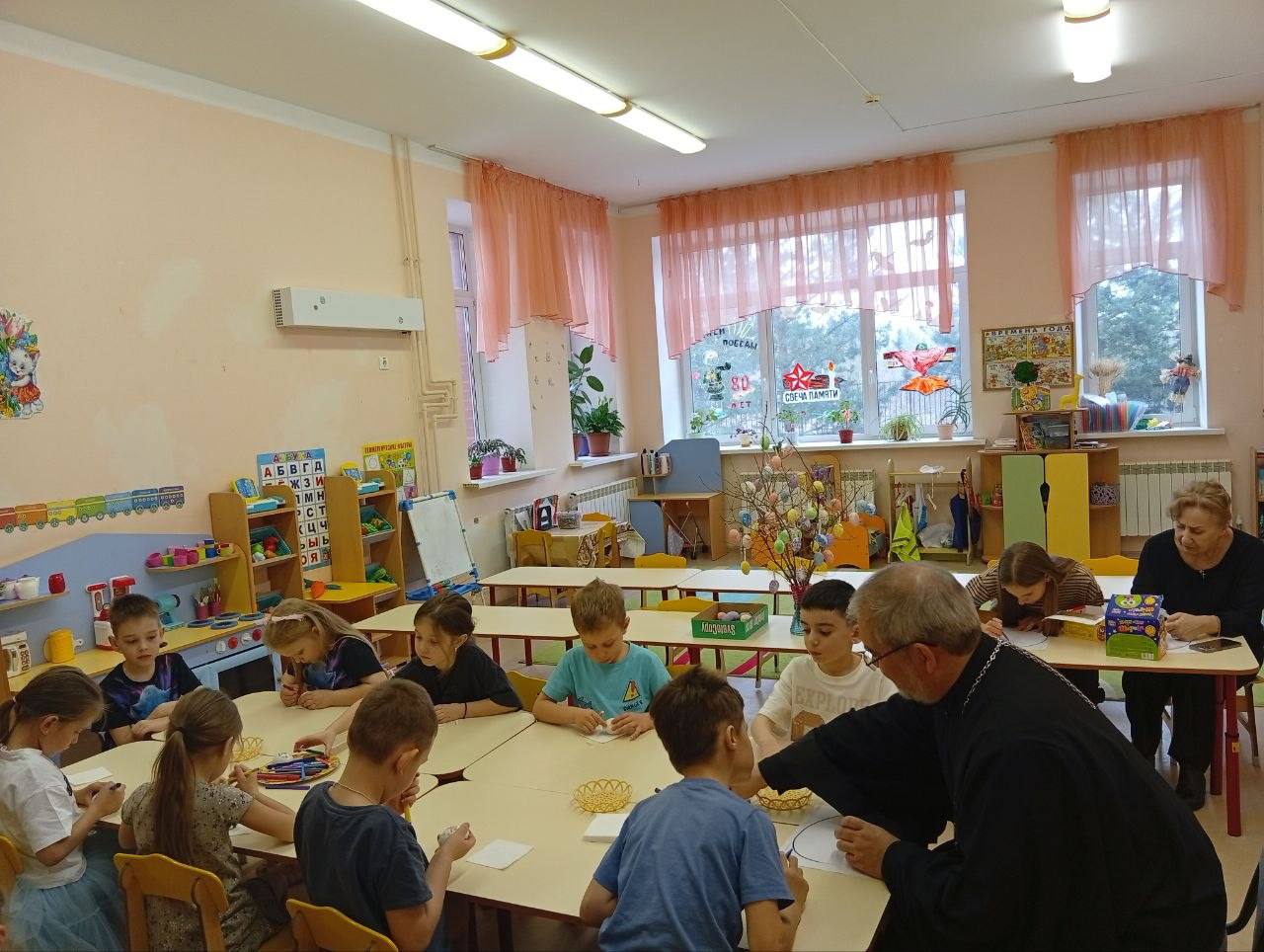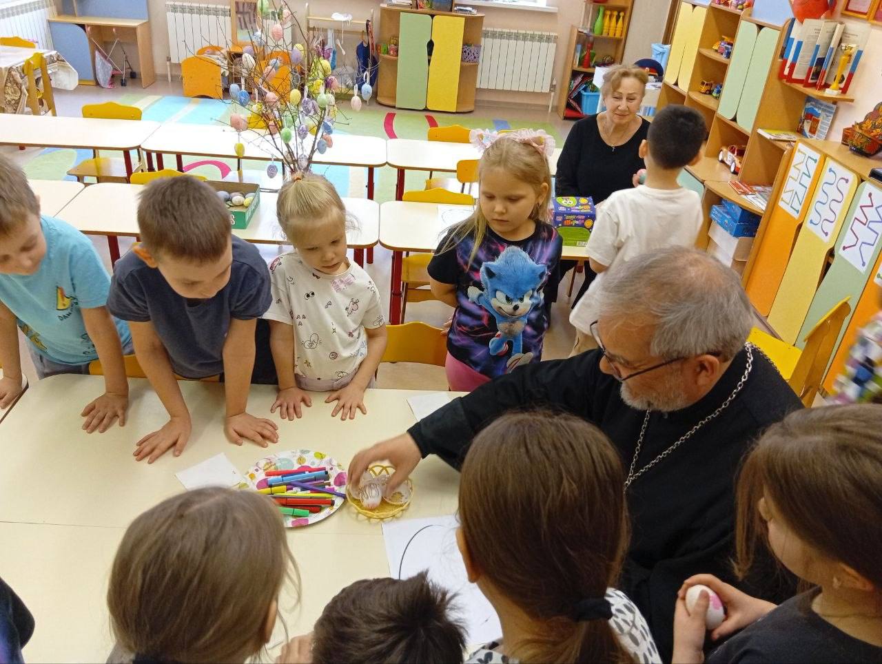 Отец Максим рассказал детям о предстоящем празднике Воскресения Христова – Пасхе. Также священник поговорил с ребятами о добре и зле, о добродетели послушания, о важном значении добрых поступков, о смысле традиции приготовления пасхальных куличей и крашеных яиц.