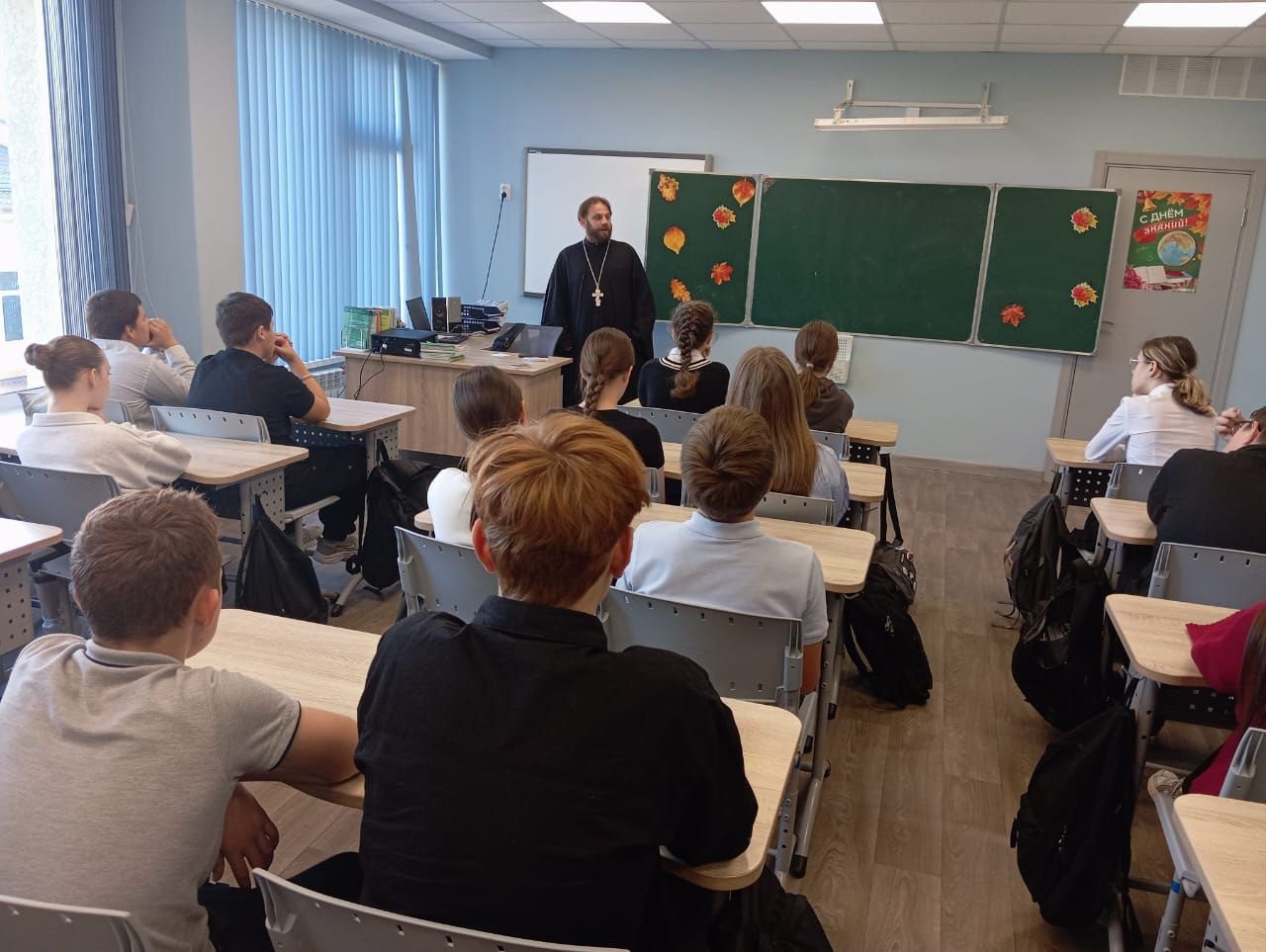 1 октября настоятель Никольского храма в д. Матренино иерей Димитрий Пищерков встретился с учениками 8 и 9 классов МОУ “Сычевская средняя общеобразовательная школа”.