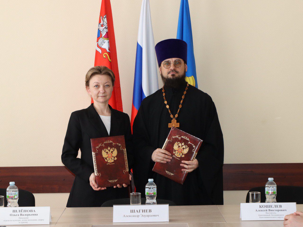 В администрации муниципального округа Лотошино состоялась встреча благочинного священника Алексия Кошелева и начальника отдела по культуре, делам молодежи, спорту и туризму Ольги Шлёновой для подписания соглашения о сотрудничестве сторон. Кроме того в мероприятии приняли участие заместитель главы муниципального округа Лотошино Александр Шагиев и руководители учреждений культуры и спорта.