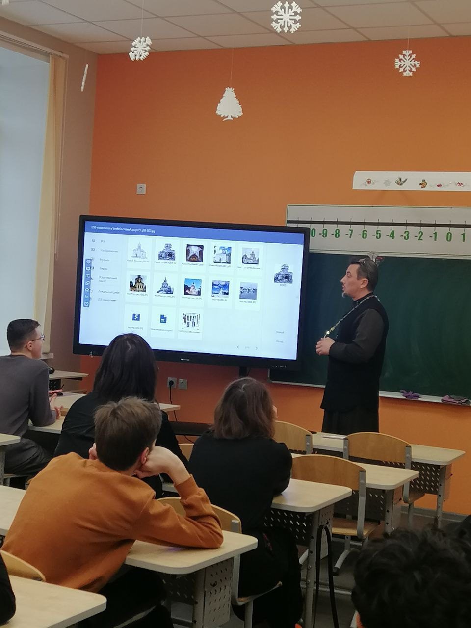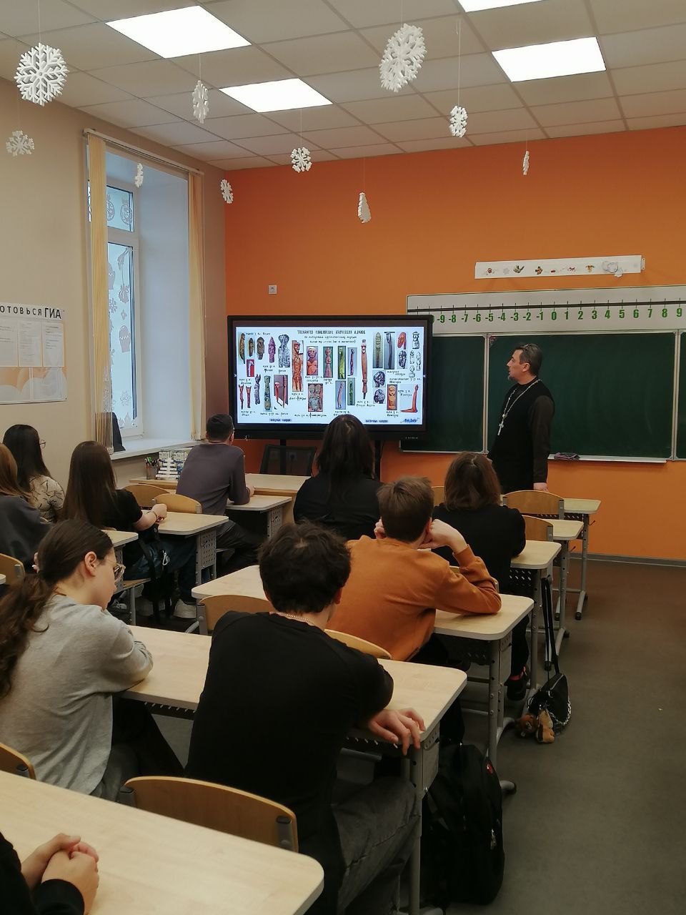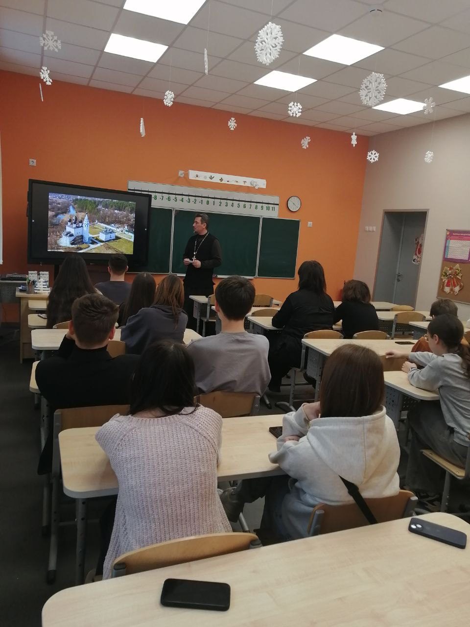 Основной акцент беседы был сделан на глубокой исторической роли православия в становлении русской цивилизации. Отец Иоанн рассказал школьникам о значении Крещения Руси, приобщении к богатой культуре Византии, появлении славянской письменности и формировании христианской идентичности, которая передавалась из поколения в поколение.
