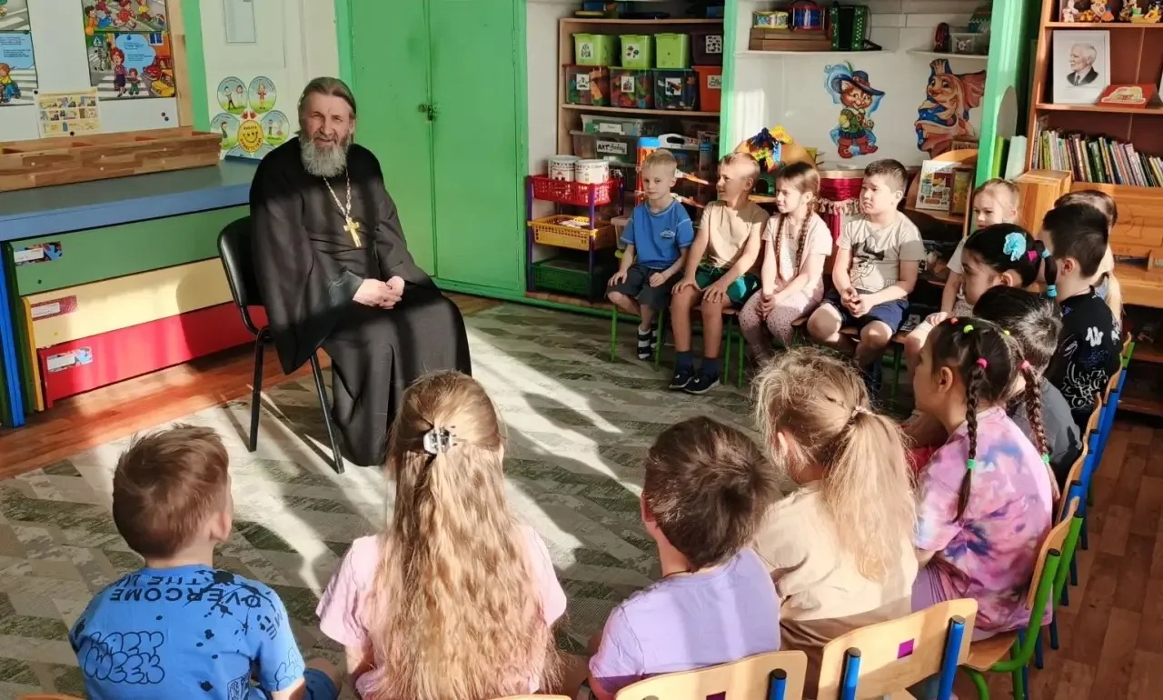 В преддверии Светлой Пасхи батюшка провел с дошкольниками живую беседу о добре, милосердии и главном христианском празднике. Дети с большим интересом слушали рассказ о традициях: о том, почему на Пасху принято красить яйца и говорить «Христос Воскресе!”.