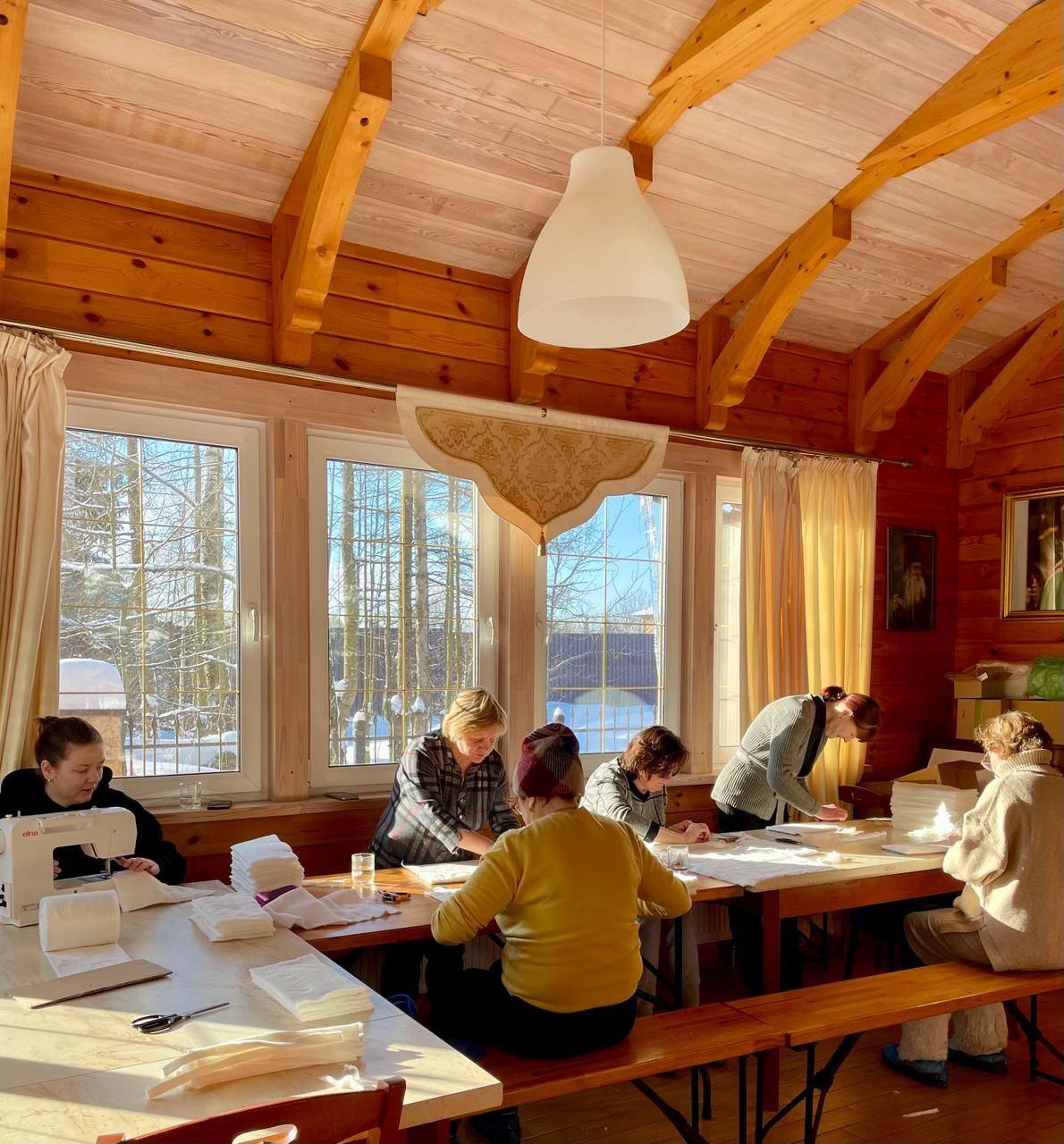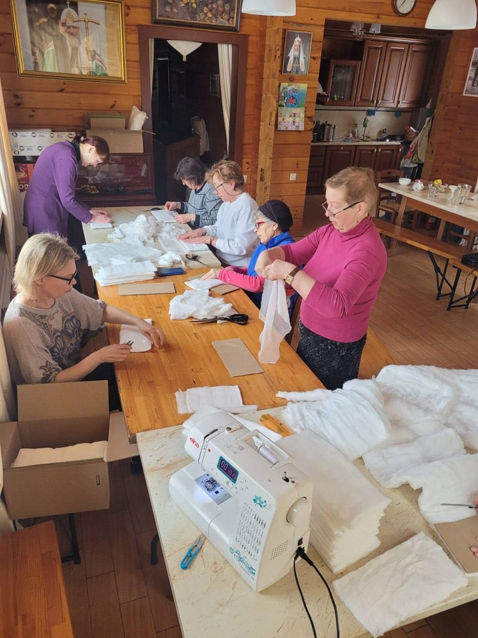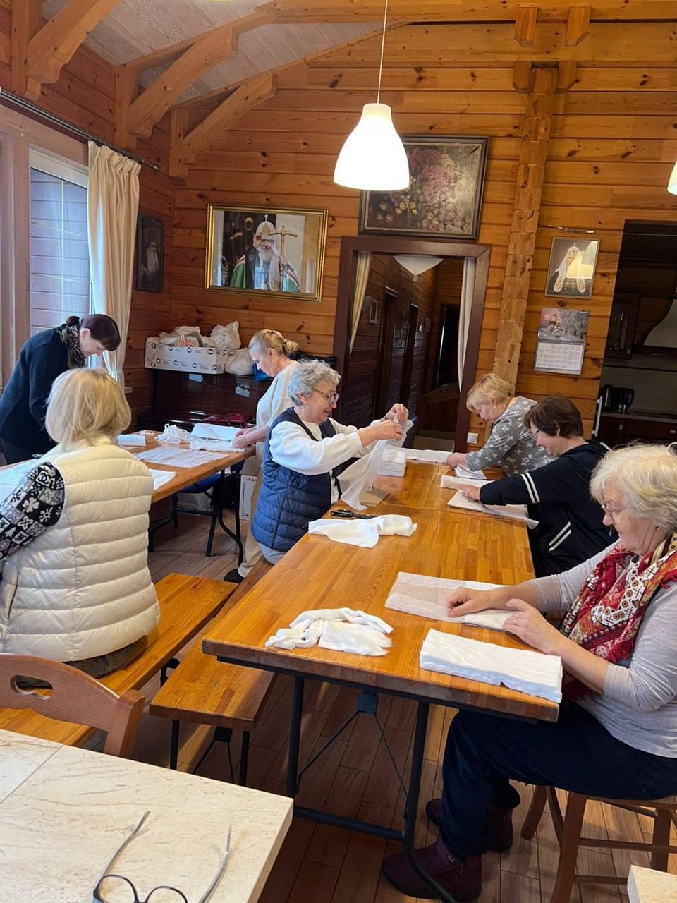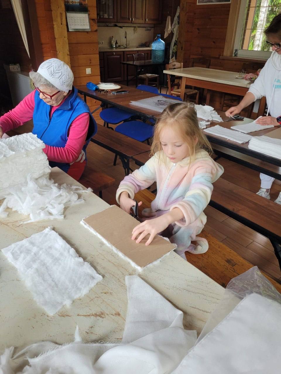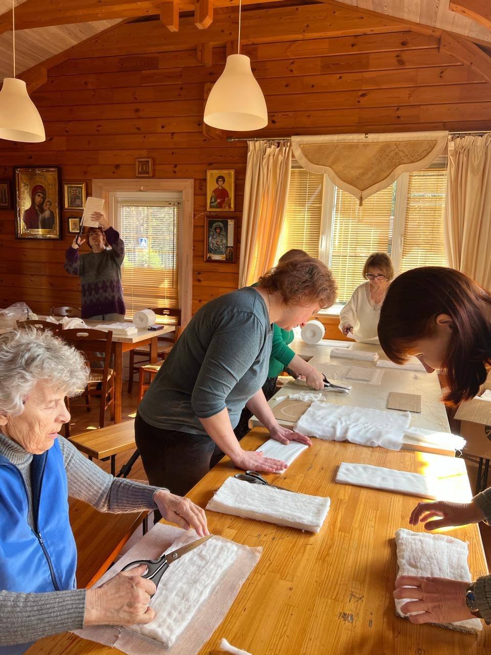 Пункт по изготовлению индивидуальных перевязочных пакетов (ИПП) при храме был создан 11 июня 2023 года. На протяжении двух с половиной лет прихожане регулярно, каждую пятницу, безвозмездно несут послушание, выполняя кропотливую работу по изготовлению стерильных перевязочных средств для бойцов и медиков, участвующих в специальной военной операции.