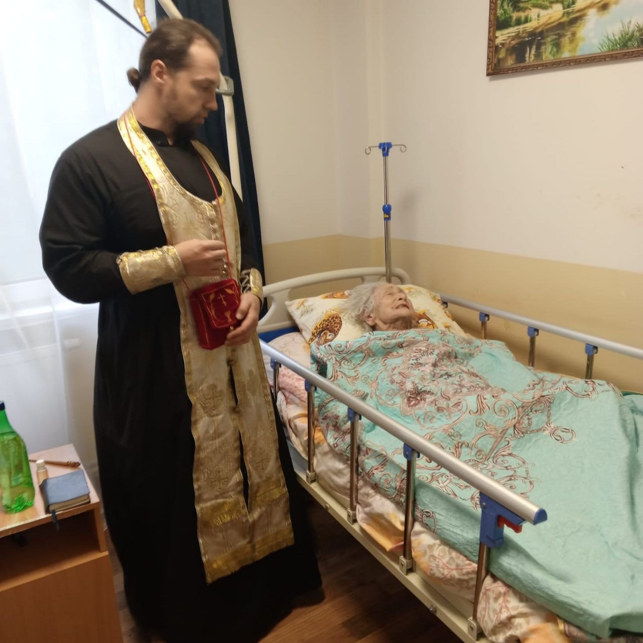 Отец Александр совершил Таинство Соборования над тяжелобольными пациентами, после чего окропил всех присутствующих святой водой и призвал на них Божие благословение.