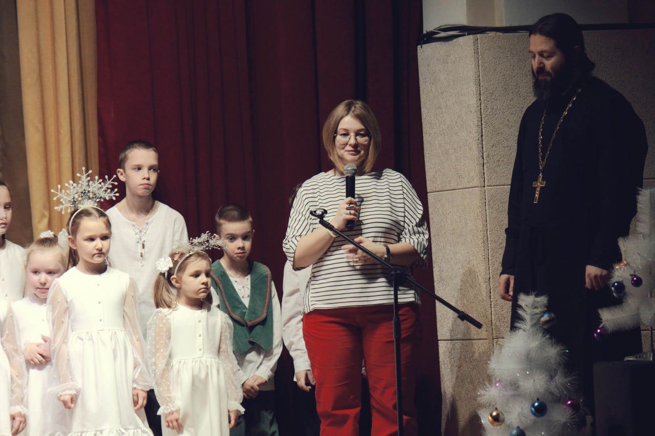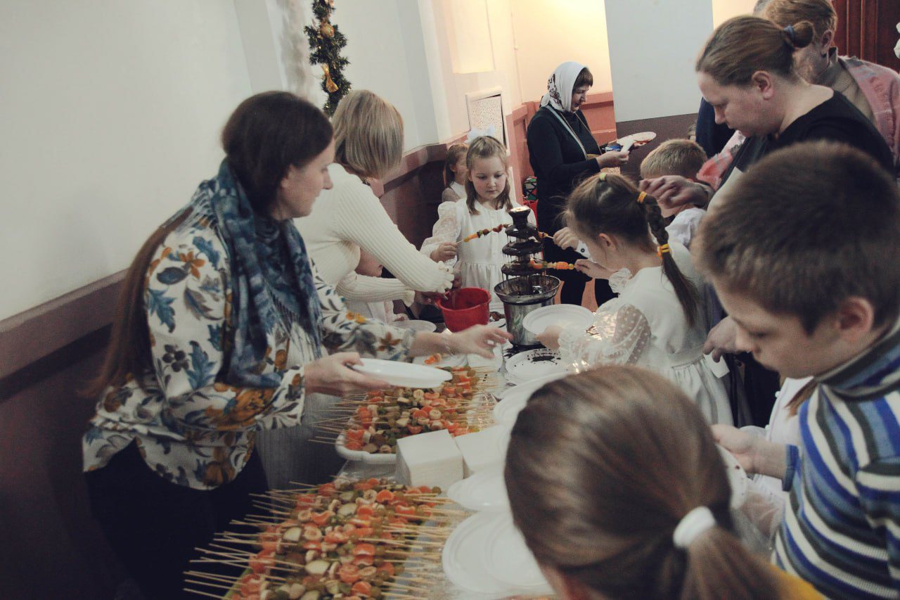 12 января в фойе Дома культуры гостей праздника встречала красивая елка, украшенный рождественский стол, вертеп и выставка рисунков учеников Воскресной школы.