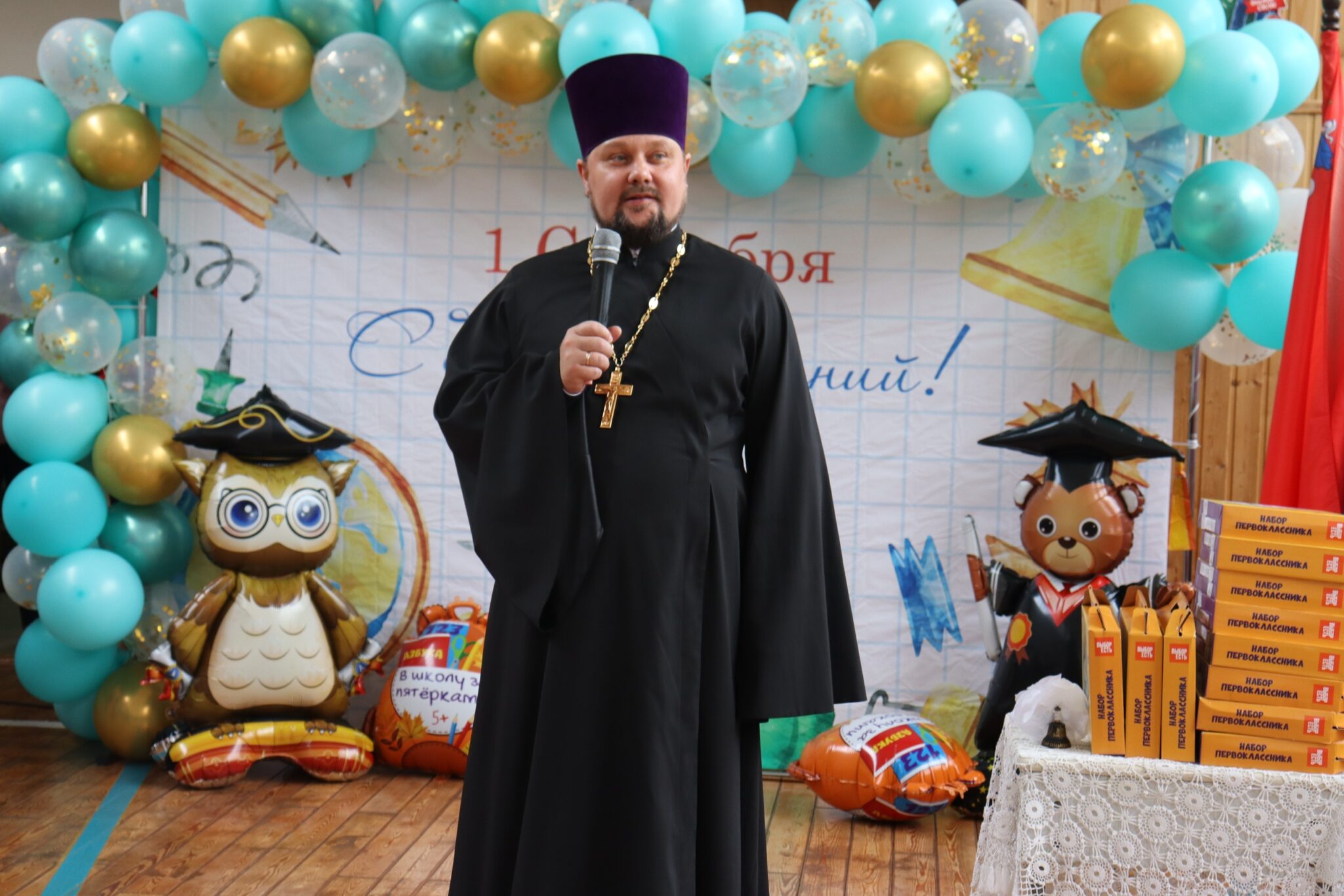 Настоятель храма Архангела Михаила с. Микулино священник Николай Попов принял участие в торжественной линейке в Микулинской гимназии.