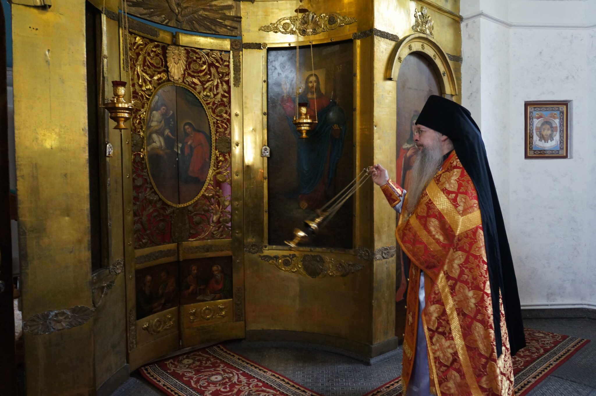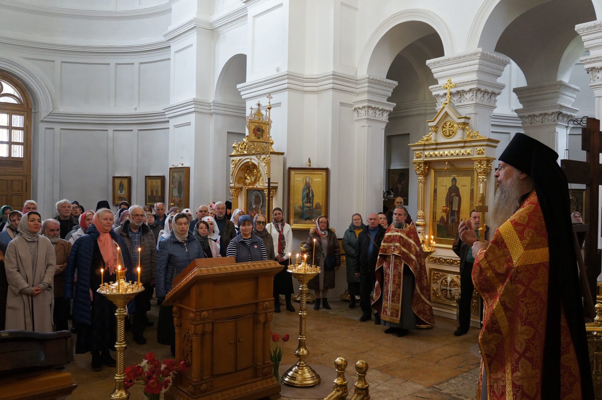 По благословению Высокопреосвященнейшего Фомы, Архиепископа Одинцовского и Красногорского, Божественную литургию во Владимирском соборе возглавил благочинный монастырского округа Одинцовской епархии игумен Авель (Пивоваров), которому сослужили: благочинный Можайского округа иерей Иоанн Лобода, член Отдела по взаимодействию с Вооруженными силами протоиерей Родион Райш, настоятель Казанского храма д. Старое Село протоиерей Георгий Шамрук и клирик Спасо-Бородинского монастыря игумен Паисий (Красюк).