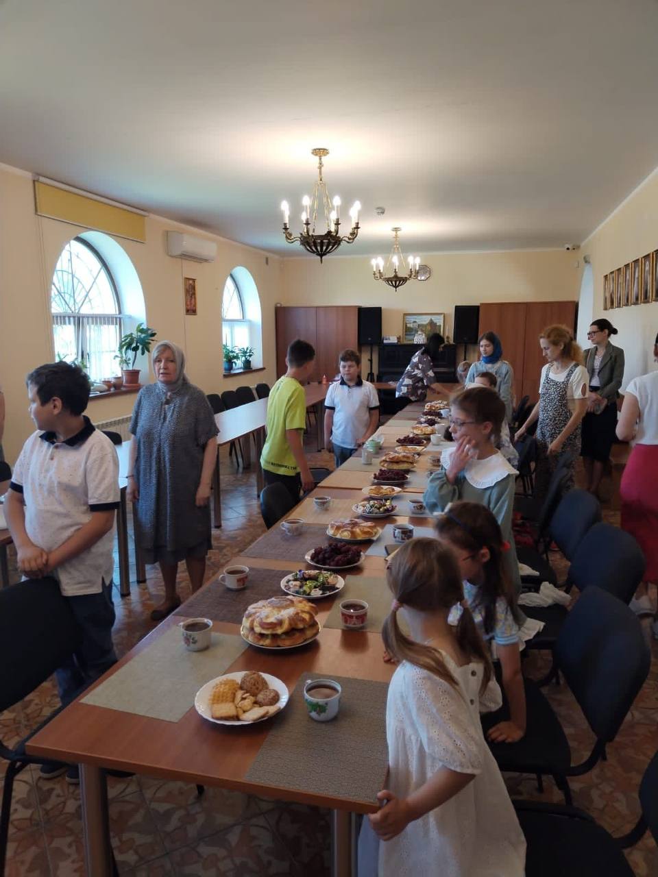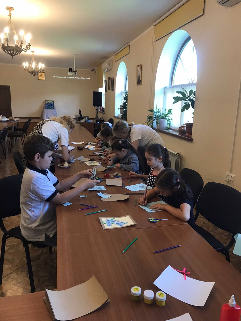 Все вместе попили чай со свежими булочками. В завершении прошёл мастер-класс по аппликации — ребята сделали замечательную открытку.