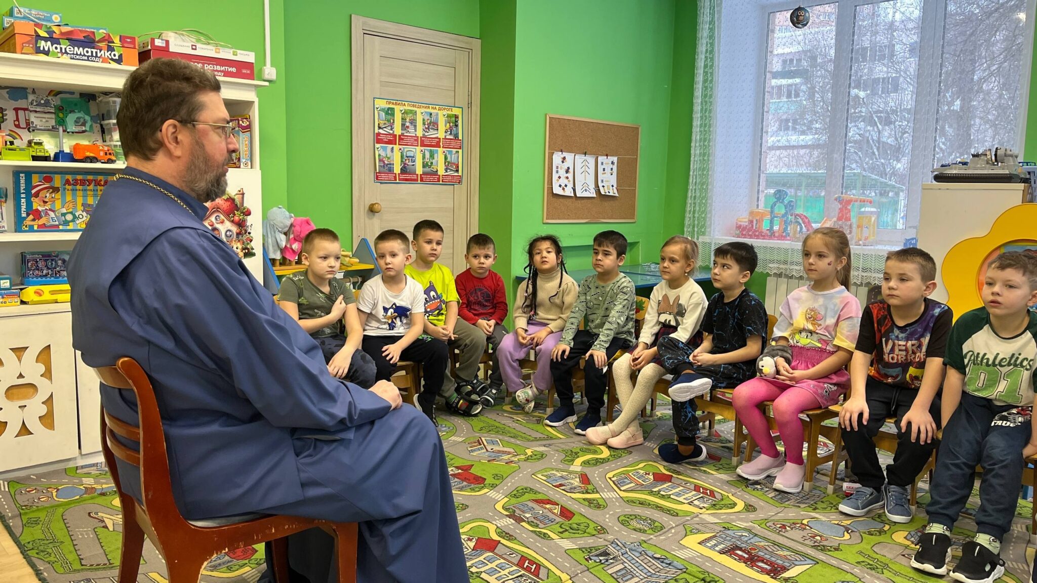 В рамках реализации плана по духовно-нравственному воспитанию в МОУ «Лицей г. Дедовск» 2-12 состоялась встреча протоиерея Александра Орлова, настоятеля Иоанно-Предтеченского храма д. Садки, с ребятами подготовительной группы.