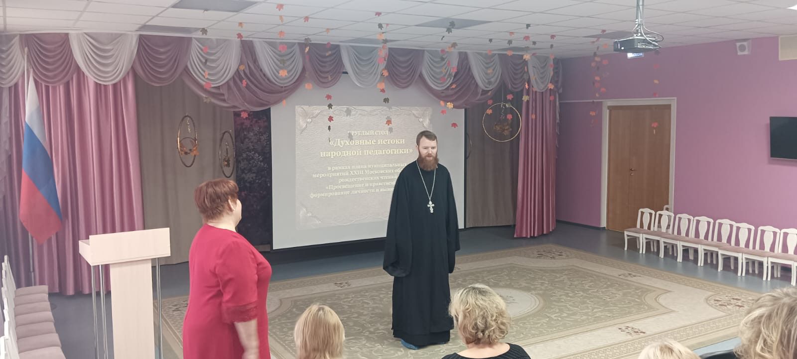 20 ноября в стенах Муниципального автономного дошкольного образовательного учреждения центр развития ребенка-детский сад “Непоседа” г. Можайска состоялся круглый стол для педагогов города, посвященный глубокой и актуальной теме: «Духовные истоки народной педагогики». Мероприятие, собравшее учителей, воспитателей, методистов, стало площадкой для живого и заинтересованного диалога о возвращении к корням народной образовательной традиции. В мероприятии принял участие член ОРОиК, священник Сергий Латышев.