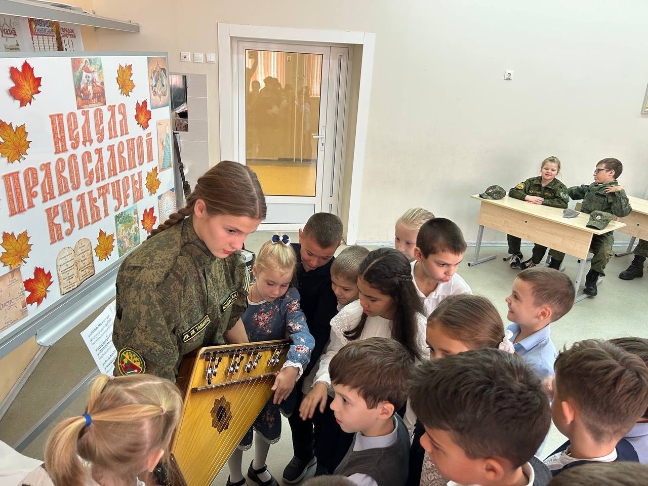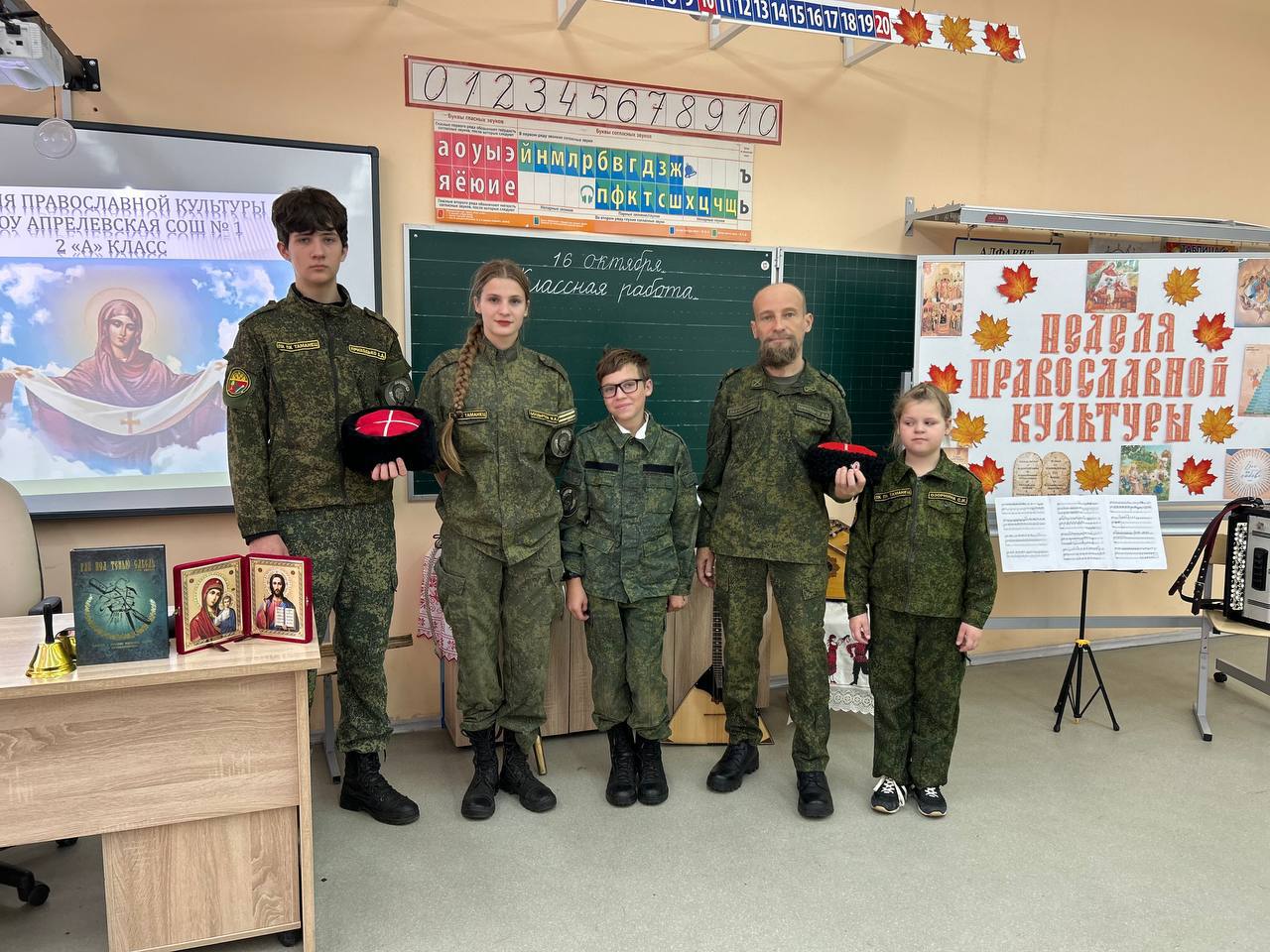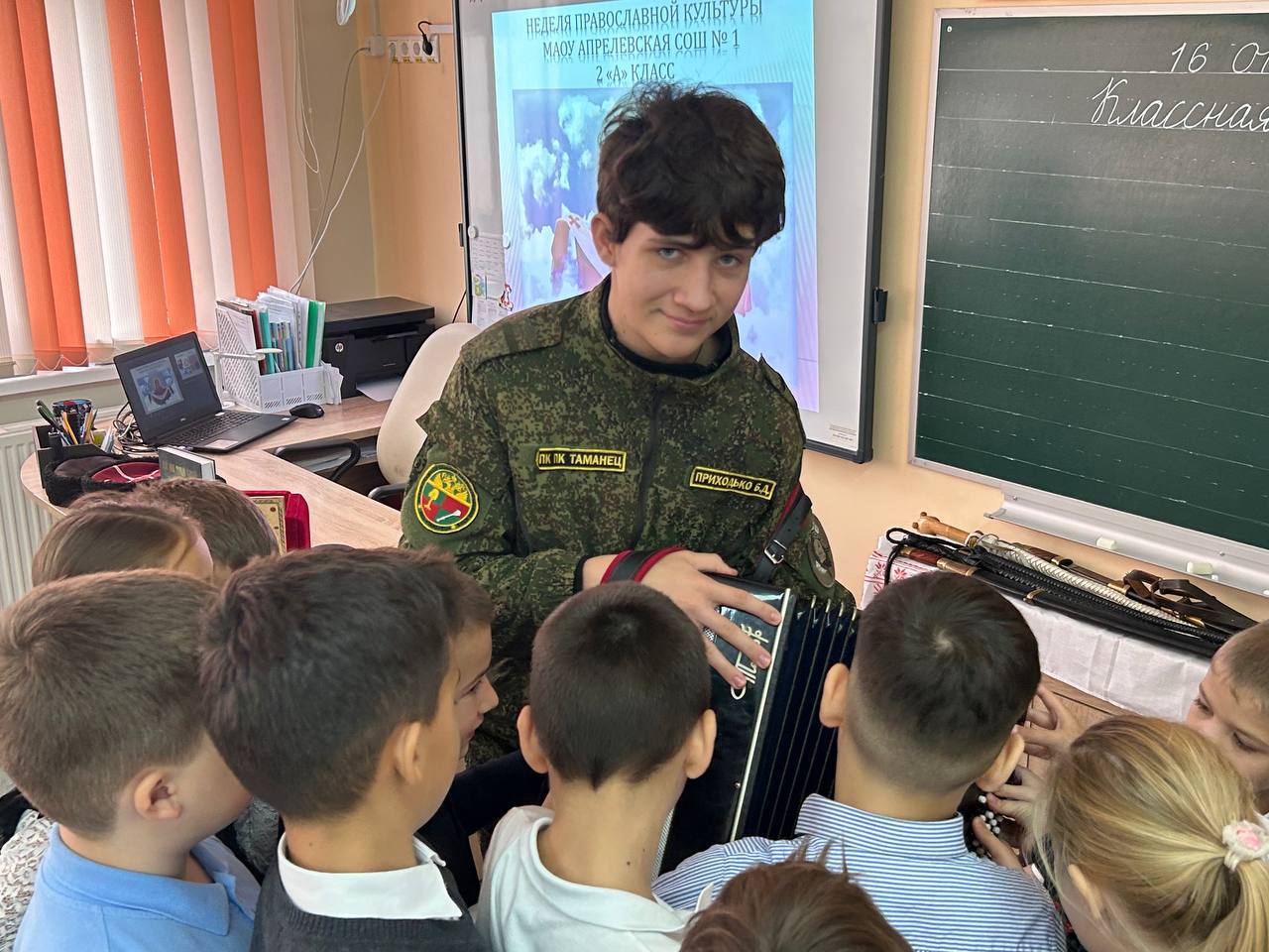 16.10.2025г. Кадеты ПК ПК ХКО «Таманец» в рамках программы «недели духовно-нравственной (православной) культуры», которая проходит во всех школах Московской области с 6 по 17 октября, посетили с дружеским визитом православный 2 А класс МАОУ Апрелевской СОШ N 1. Кадеты познакомили ребят православного класса с казачьей культурой, которая не раздельно связана с православием. Ребятам прочли казачью сказку, познакомили с историей происхождения русских народных инструментов таких как: баян, гусли, балалайка. Кадеты ПК ПК ХКО «Таманец»выступили с музыкальными произведениями.Школьников познакомили с искусством владения шашкой и провели мастер класс по фланкеровке. Ребятам рассказали о православном казачьем патриотическом клубе «Таманец» и пригласили всех желающих на занятия.