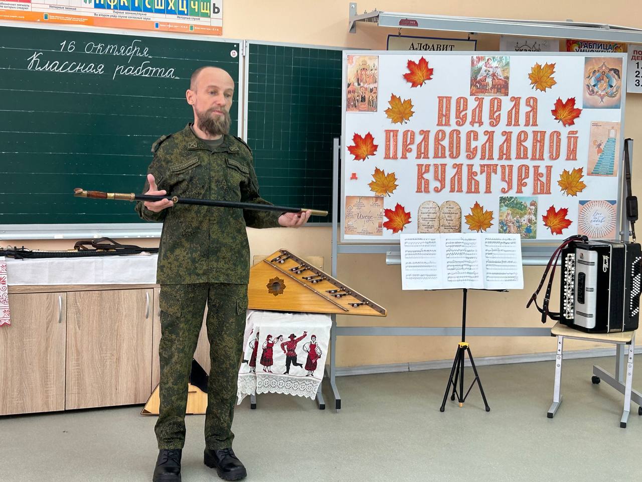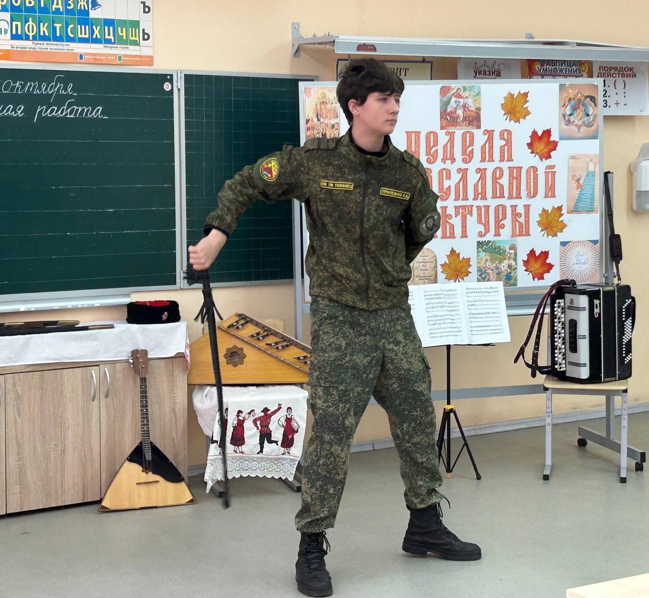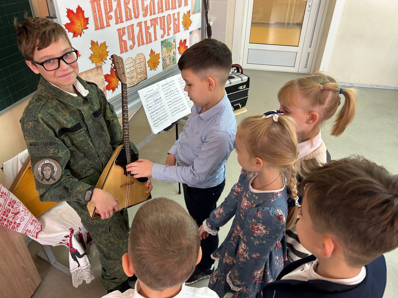 16.10.2025г. Кадеты ПК ПК ХКО «Таманец» в рамках программы «недели духовно-нравственной (православной) культуры», которая проходит во всех школах Московской области с 6 по 17 октября, посетили с дружеским визитом православный 2 А класс МАОУ Апрелевской СОШ N 1. Кадеты познакомили ребят православного класса с казачьей культурой, которая не раздельно связана с православием. Ребятам прочли казачью сказку, познакомили с историей происхождения русских народных инструментов таких как: баян, гусли, балалайка. Кадеты ПК ПК ХКО «Таманец»выступили с музыкальными произведениями.Школьников познакомили с искусством владения шашкой и провели мастер класс по фланкеровке. Ребятам рассказали о православном казачьем патриотическом клубе «Таманец» и пригласили всех желающих на занятия.