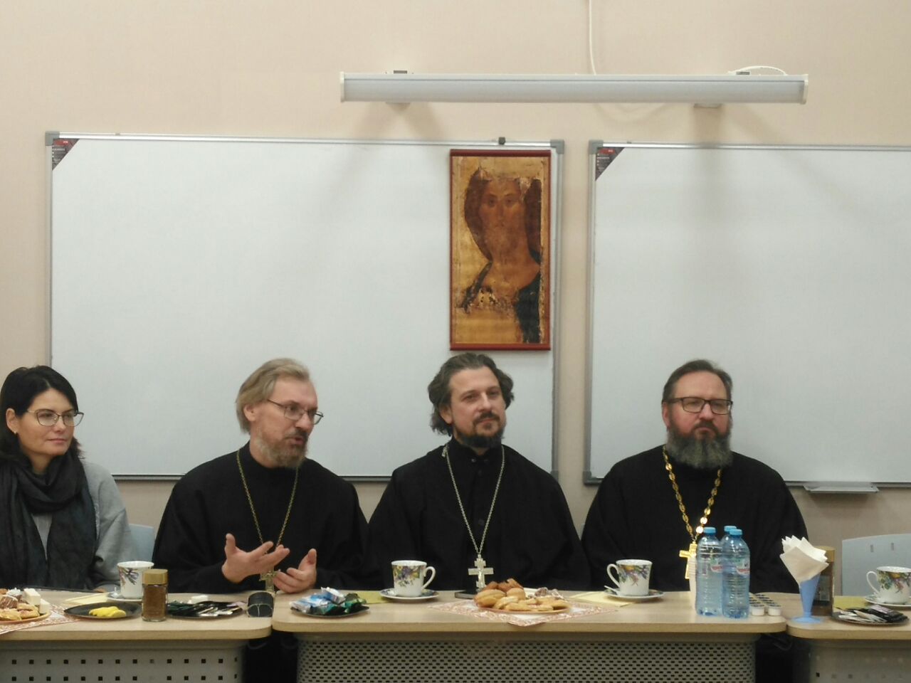 Встреча прошла в непринужденной и доброжелательной атмосфере. Священники поделились опытом проведения курса бесед в СОШ №2 им. Лермонтова г. Истра, и в дошкольных заведениях г. Истра. Представленный опыт послужил основой для живого осуждения и дискуссии по поиску новых форм для взаимодействия педагогов и духовенства Истринского район.