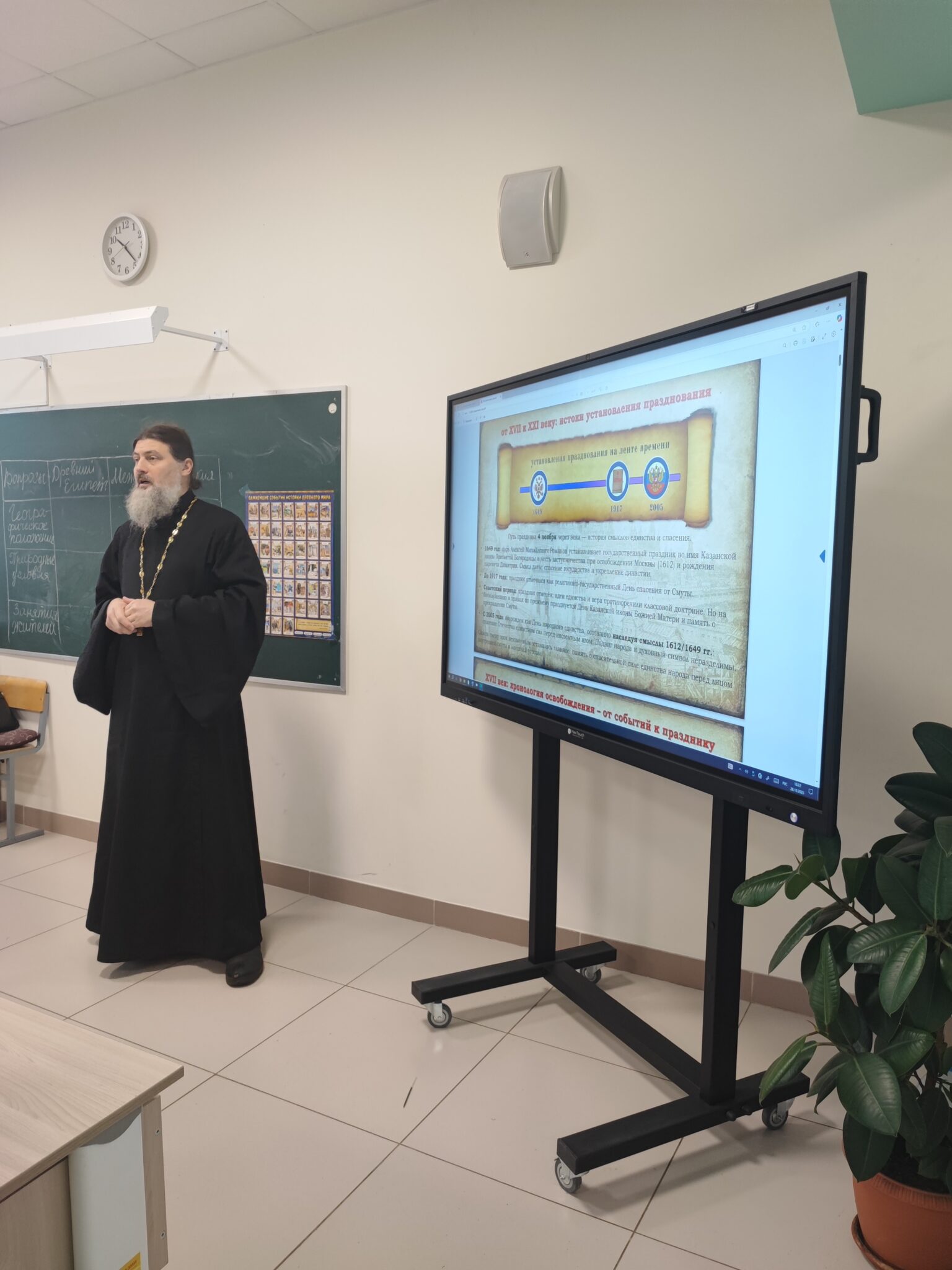 28 октября в Новогородковской СОШ священник Алексий Калачиков, ответственный по культуре в Звенигородском благочинии, провел урок в 9-х классах, посвященный празднованию Дня народного единства.