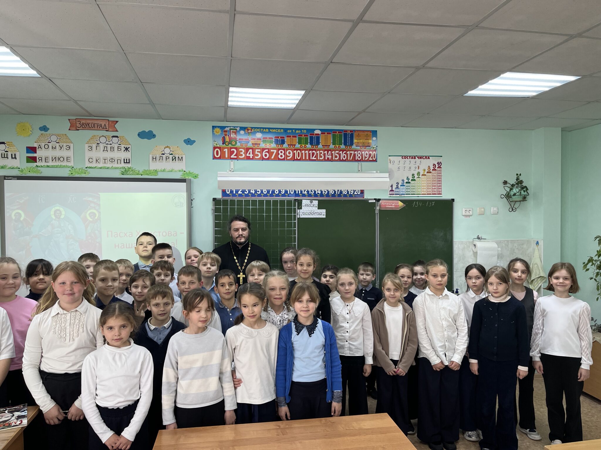 20 мая, в рамках миссионерской акции «Пасха Христова – наша Победа», состоялась беседа настоятеля Христорождественского храма села Филатово священника Романа Лазарева со школьниками Общеобразовательной школы поселка Румянцево. В ходе урока, священнослужитель рассказал детям о событии Воскресения Христова и его нравственном значении для христианина, а также исторических предпосылках праздника и прообразах Спасителя в Ветхом Завете. Тема празднования 80-летия Победы в Великой Отечественной войне, победоносное окончание которой в 45-м, совпало с ликованием дней Светлой седмицы, стала продолжением беседы, которая затронула теперь понятия о любви к Отечеству земному. Поговорили о жизненном пути маршала Победы Георгия Константиновича Жукова, а также о том неоценимом вкладе, который внесла в дело Победы над фашизмом Русская Православная Церковь.