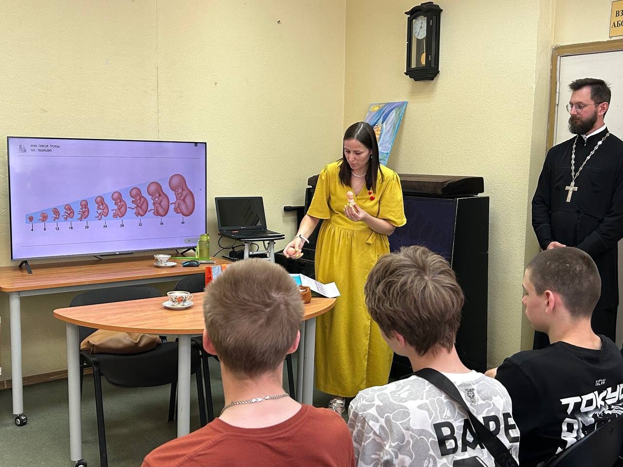 Прихожанка Троицкого храма п. Назарьево Голикова Регина Георгиевна, многодетная  мама, волонтёр фонда “Женщины за жизнь”, рассказала ребятам о ценности жизни с момента зачатия, об ответственном подходе к отношениям и родительству.