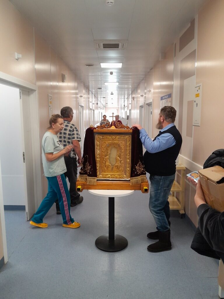 После совместной молитвы все присутствующие были помазаны святым елеем, отец Валерий обратился с напутственным словом. Всем были подарены акафисты и иконочки Божией Матери. Далее священники обошли с иконой терапевтическое и гинекологическое отделения, где желающие прикладывались к иконе и священнослужители совершали помазание святым елеем. В гинекологическом отделении были розданы антиабортные листовки, а также брошюры с покаянным каноном.