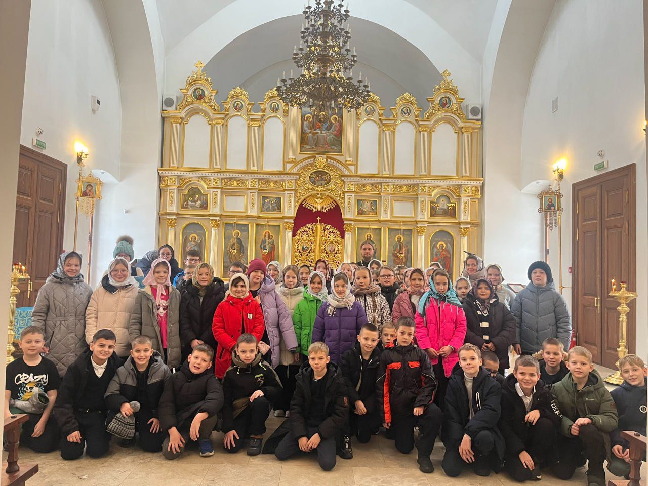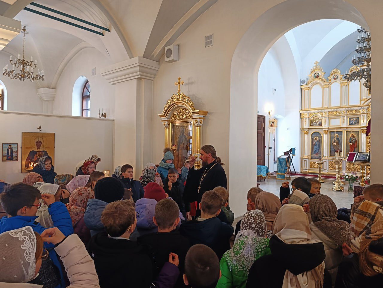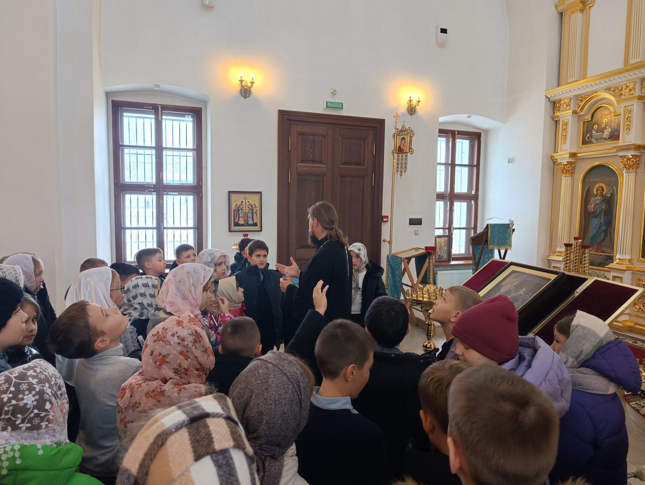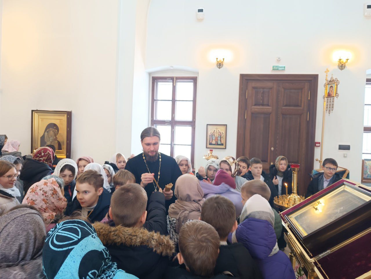 Настоятель храма священник Алексий Вареников провел для ребят экскурсию. Рассказал об устройстве храма, о молитве, о крестном знамении. Затем батюшка побеседовал с детьми о подвиге народа и роли Русской Православной Церкви в годы Великой Отечественной войны, а также о помощи Царицы Небесной всем к ней обращающимся.