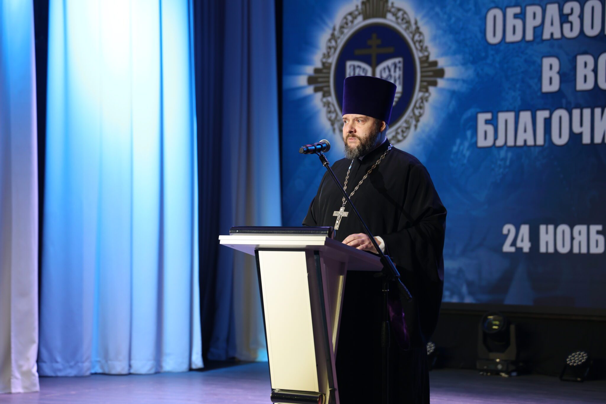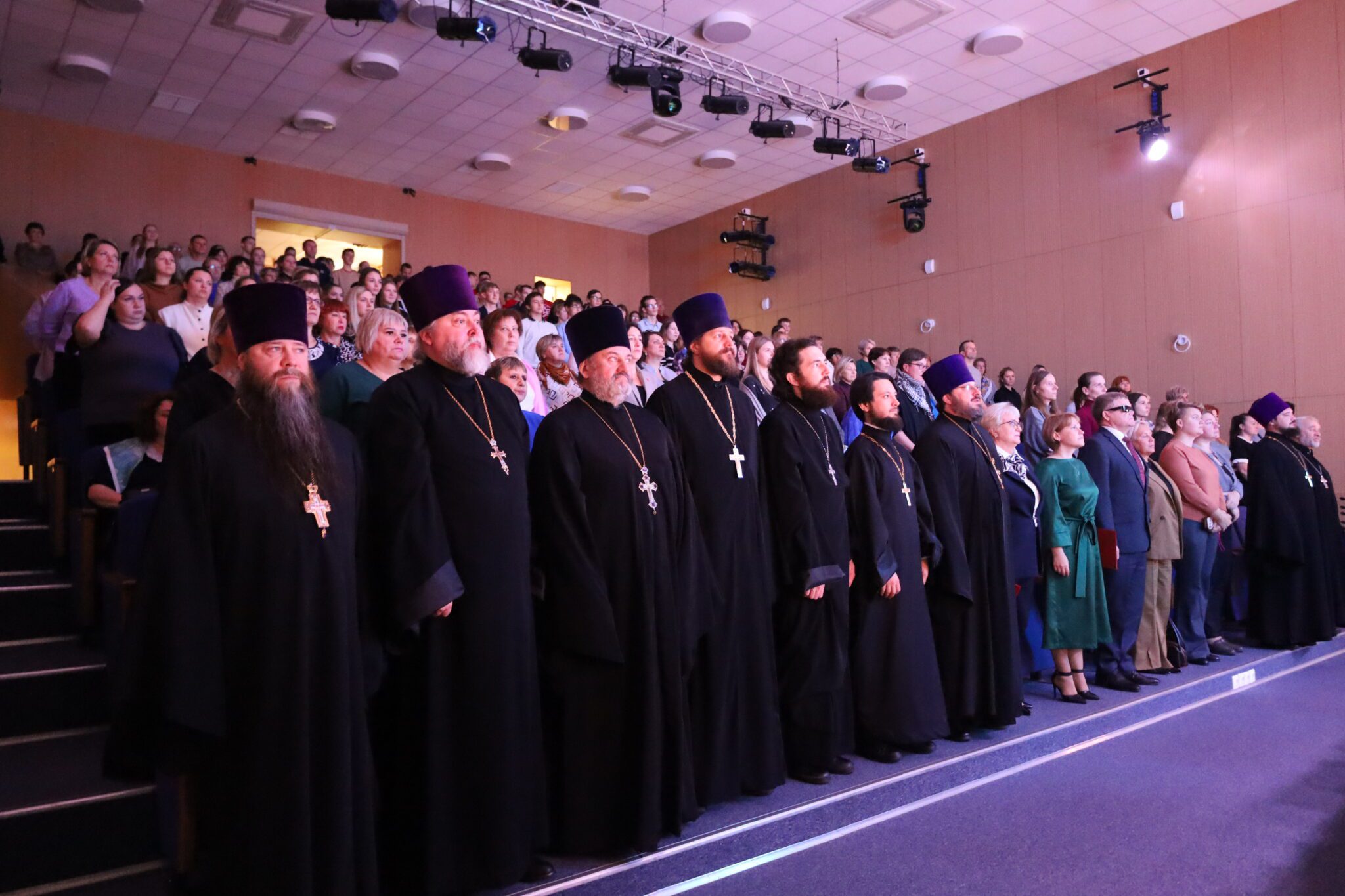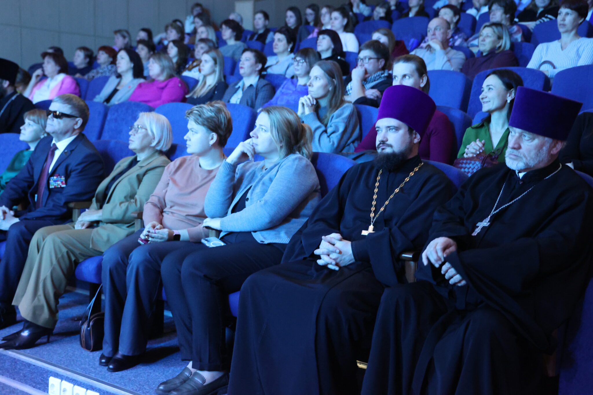В зале собрались священнослужители, директора общеобразовательных школ и учителя, представители школьных патриотических организаций округа, дети, выступавшие с творческими номерами и родители.