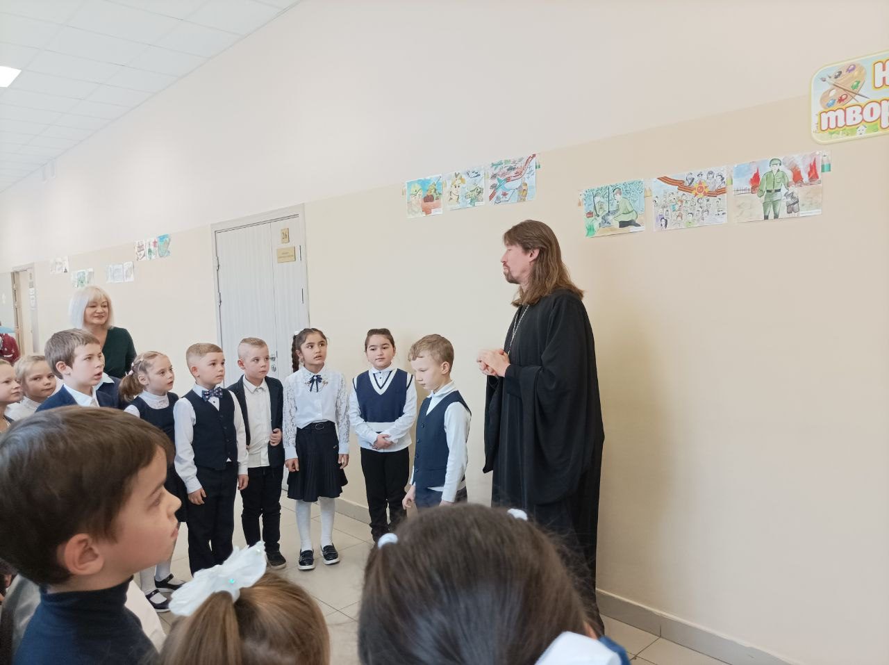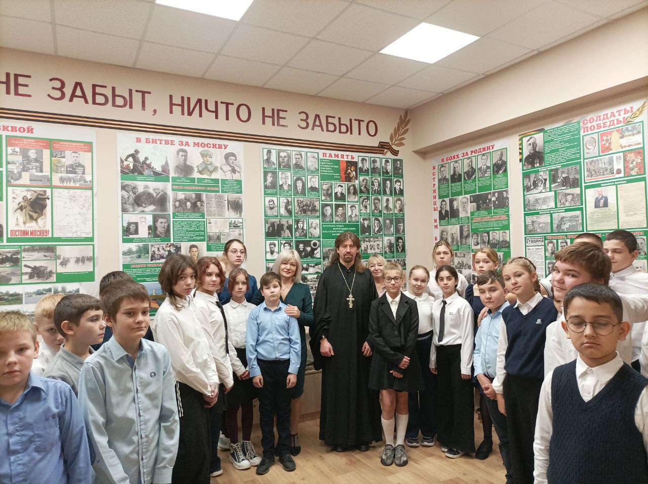 28 ноября в Средней общеобразовательной школе имени А.П. Чехова города Истра, в рамках Рождественских чтений, посвященных 80-летию Великой Победы: памяти и духовного опыта поколений, для учеников пятых классов был проведен тематический урок на котором присутствовал настоятель Вознесенского храма города Истра священник Максим Бунеев. После вступительного слова Заместителя директора по воспитательной работе Надежды Ивановны Барановой, священник Максим Бунеев обратился к учащимся с приветственным словом, в котором подчеркнул важность празднования события годовщины Великой Победы. Также отметил, что мы, только если остаемся едиными с нашим народом в его истории, делаемся его наследниками в его Великих достижениях. После это все собравшиеся посетили школьный музей Боевой Славы, находящийся в здании школы, где с историческим докладом о героях войны – бывших выпускниках школы, выступила руководитель музея Татьяна Ивановна Кондратова. В конце урока состоялся просмотр выставки школьного рисунка, посвященных 80-летию Великой Победы, где к собравшимся присоединились и ученики начальной школы.