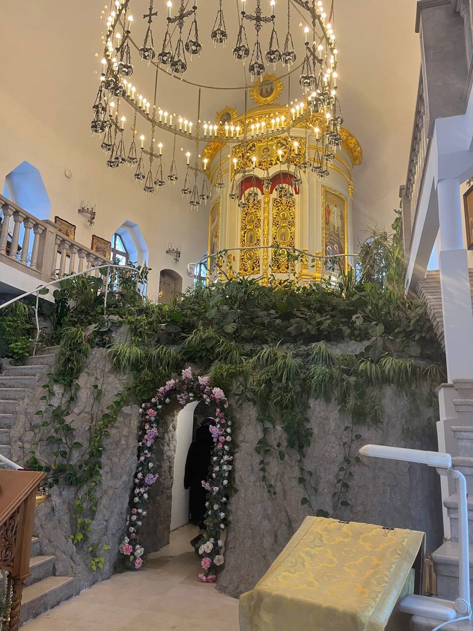 Паломники помолились в Спасо-Вифанском скиту, поразившим своей необычайной красотой. Два престола в одном храме: верхний в честь Преображения Господня и нижний, в честь воскрешения Лазаря устроен в алтаре, обращенная к молящимся стена которого представляла вид искусственной пещеры.